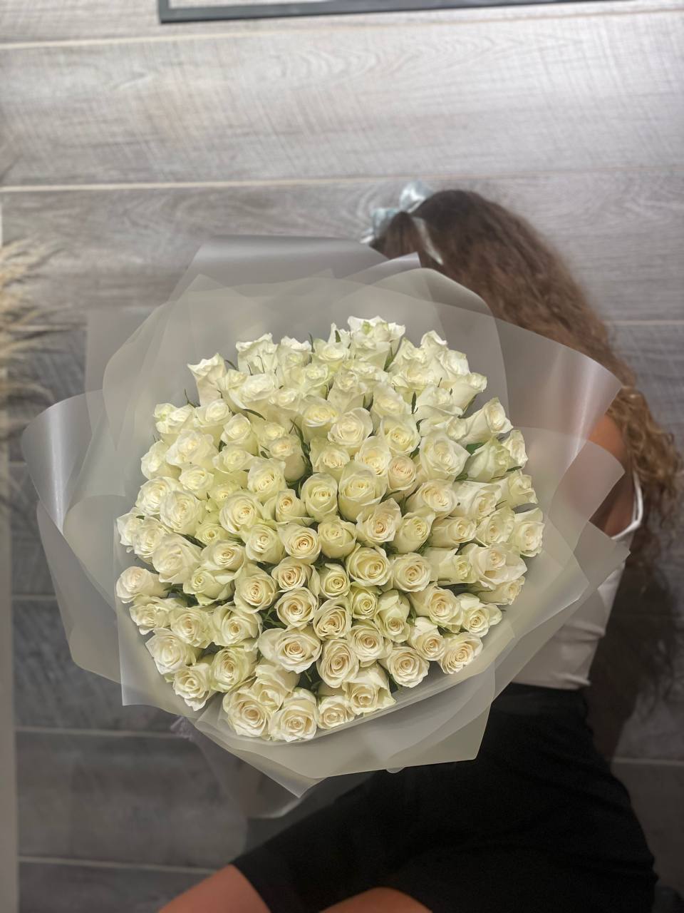 Сто одна белоснежная роза из Кении собрана в монохромную композицию с безупречной геометрией. Каждый бутон держит форму и создаёт плотное облако света. Для момента когда слова не нужны.