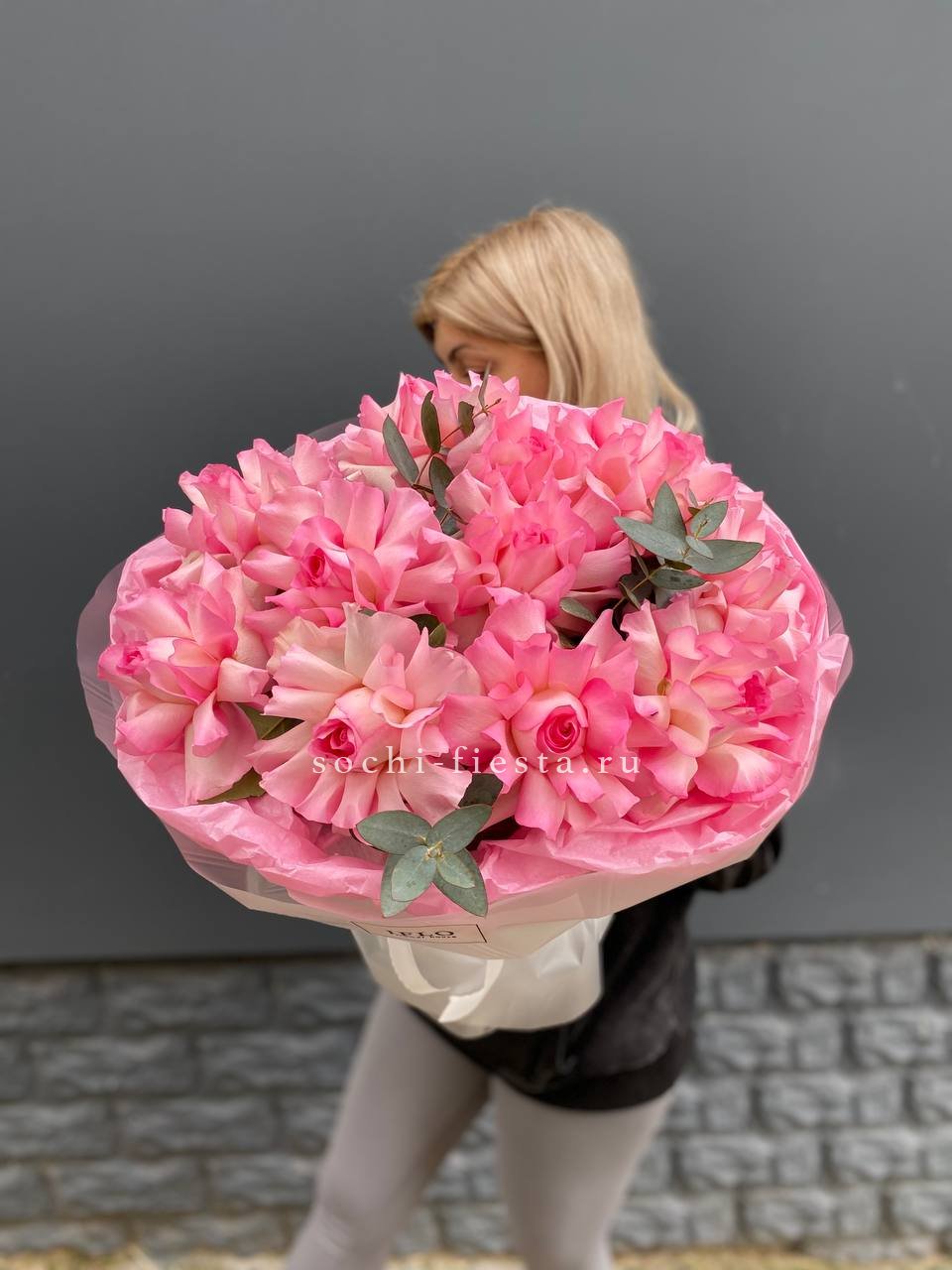 Одиннадцать французских роз выстроены в округлую композицию с веточками эвкалипта. Бутоны крупные и плотные, держат форму и наполняют пространство свежим присутствием.