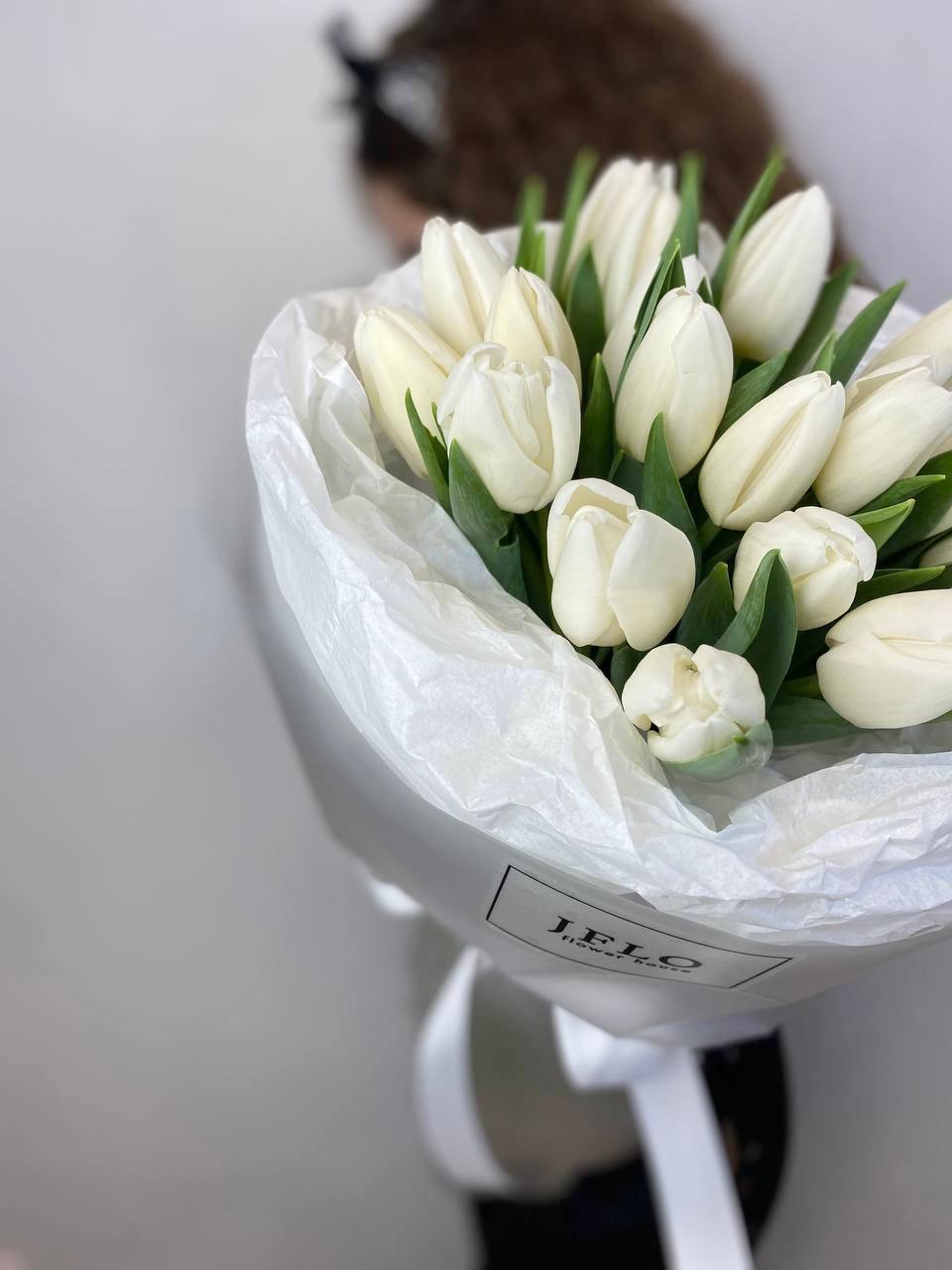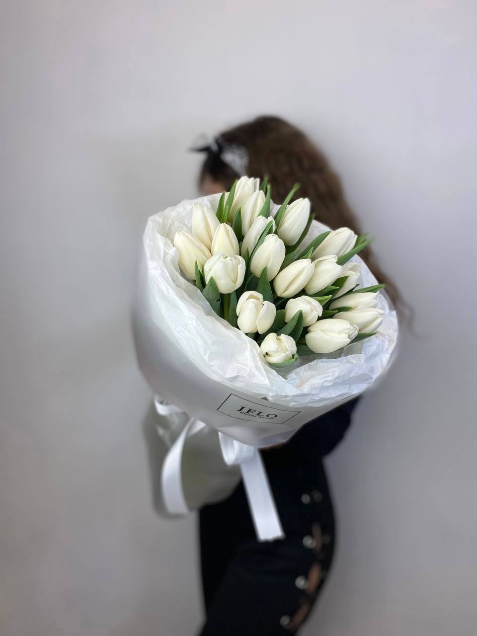 Девятнадцать белых тюльпанов собраны в плотный монобукет с ровными линиями и чистым силуэтом. Белизна лепестков создаёт ощущение света и пространства.