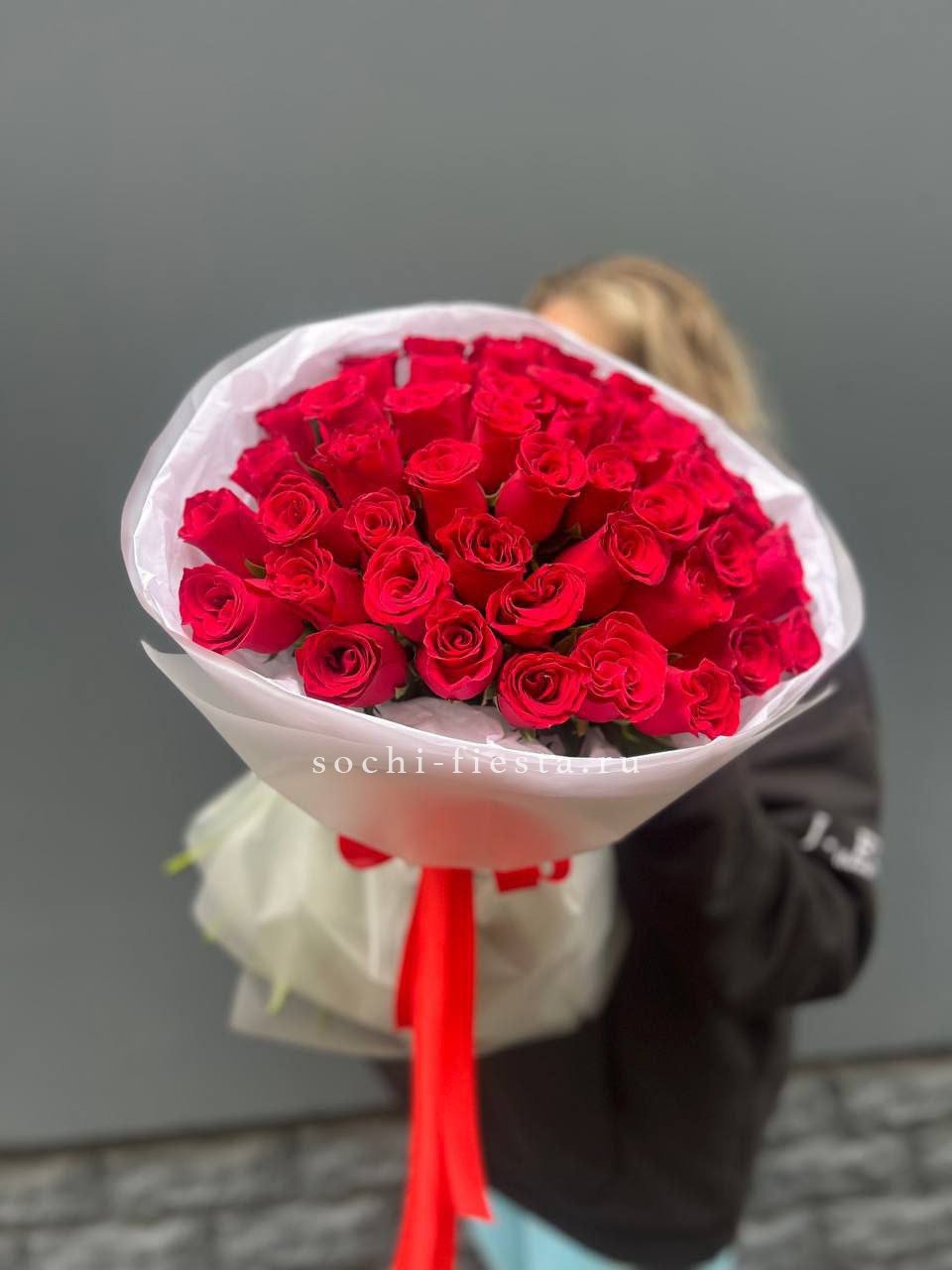55 красных роз, лента, упаковка.