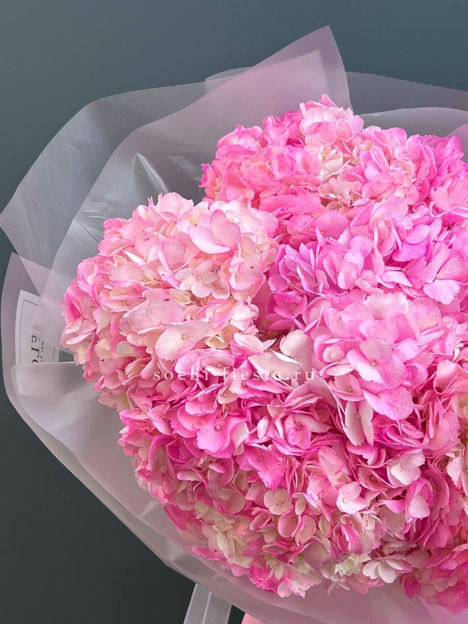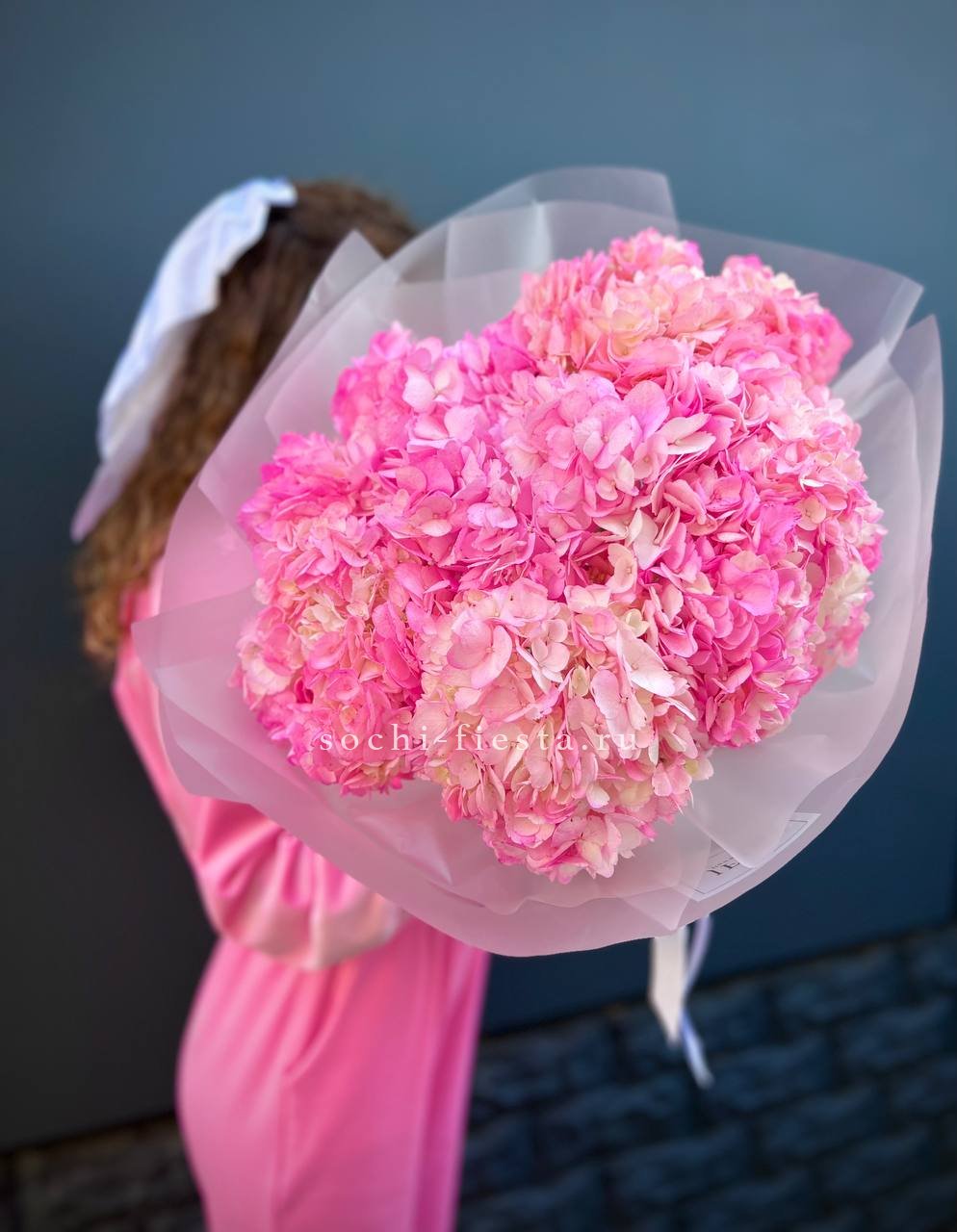Семь крупных соцветий насыщенного розового оттенка собраны в плотный букет с выразительным силуэтом. Каждая гортензия раскрывает объёмную шапку лепестков, создавая впечатляющее присутствие в любом пространстве.