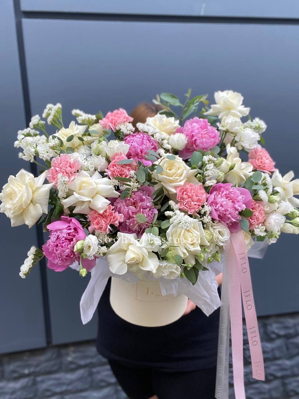 гортензия, вывернутые розы, лимониум(или аналог в несезон), лента, авторская упаковка.