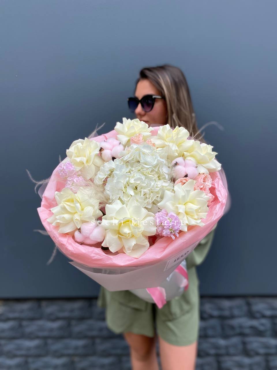 гортензия, хлопок, бомбастик, белая роза, маттиола- может меняться от сезона на диантус, ковыль, упаковка.