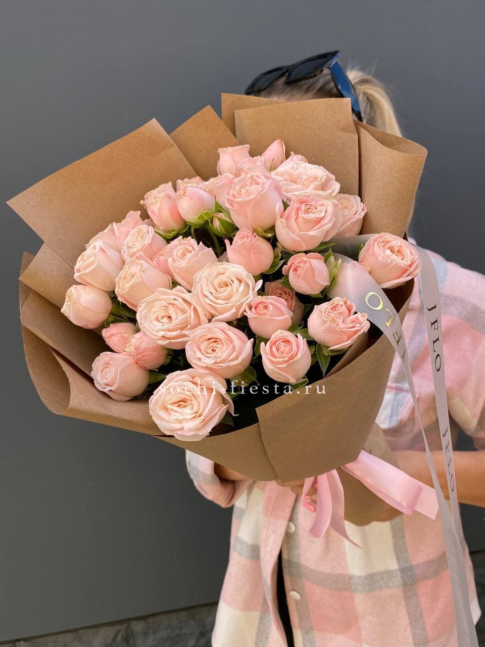 кустовые розы, эустома, хлопок, лента и дизайнерская пленка.