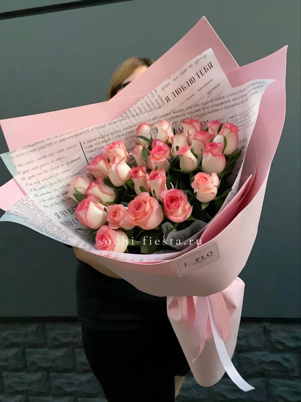розы пионовидные белые и кремовые - 31 шт., лента, крафт.