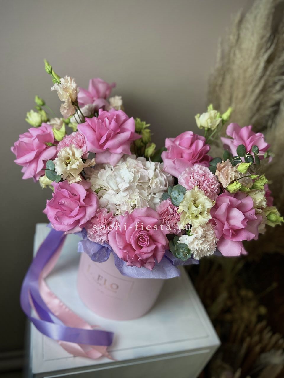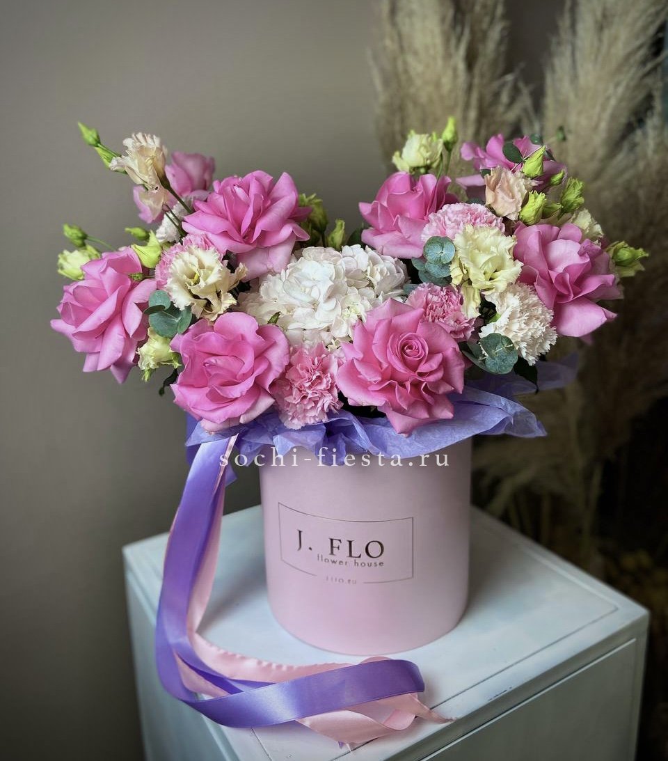 розовые розы, диантус, озатамус, гортензия, нежное оформление.