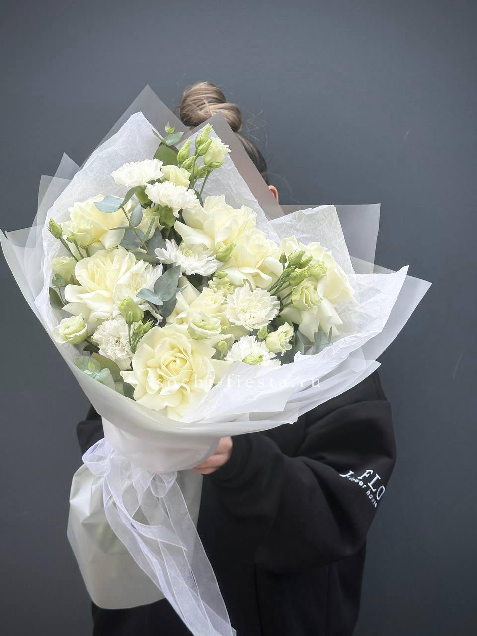 белые розы, диантус, хризантема кустовая, эустома, эвкалипт, лента, авторское оформление.