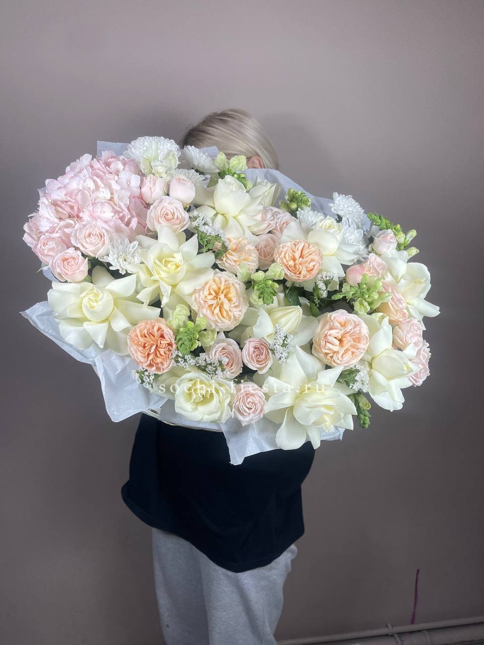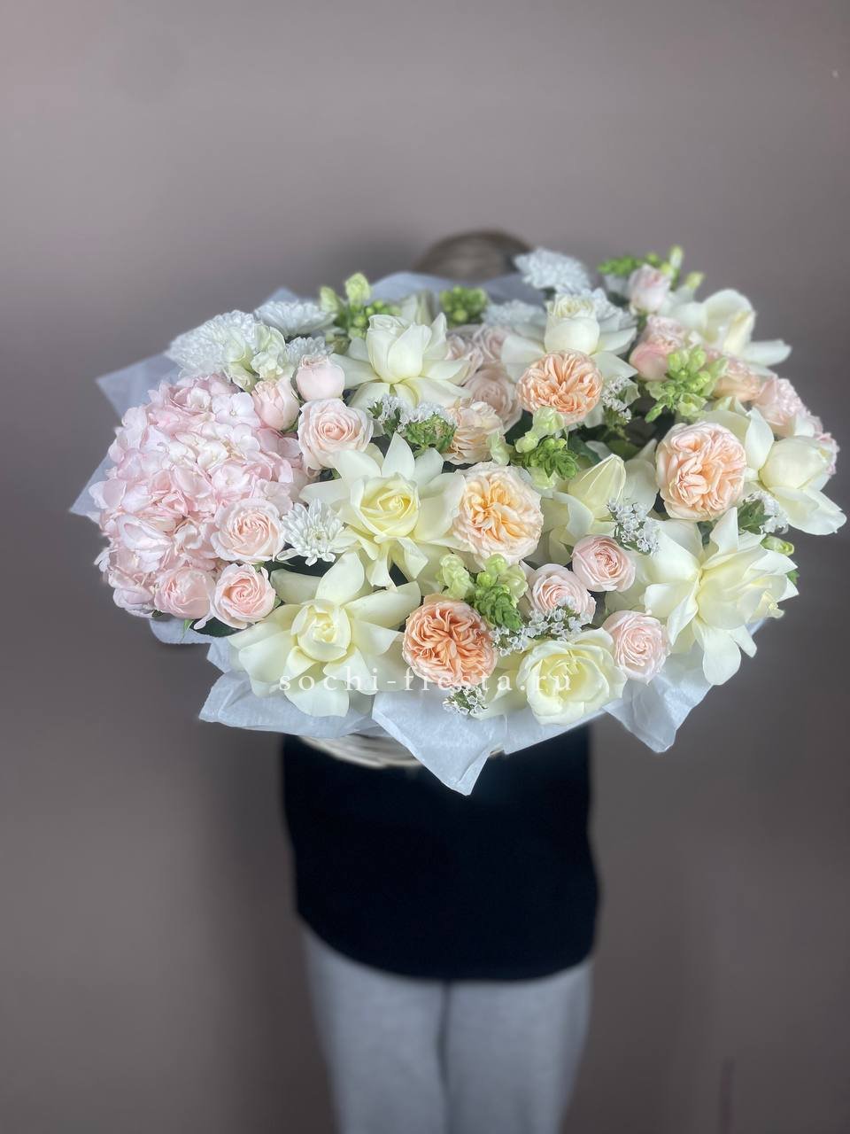 вывернутые розы, гортензия, пионовидные розы, эустома, лента, авторская упаковка.