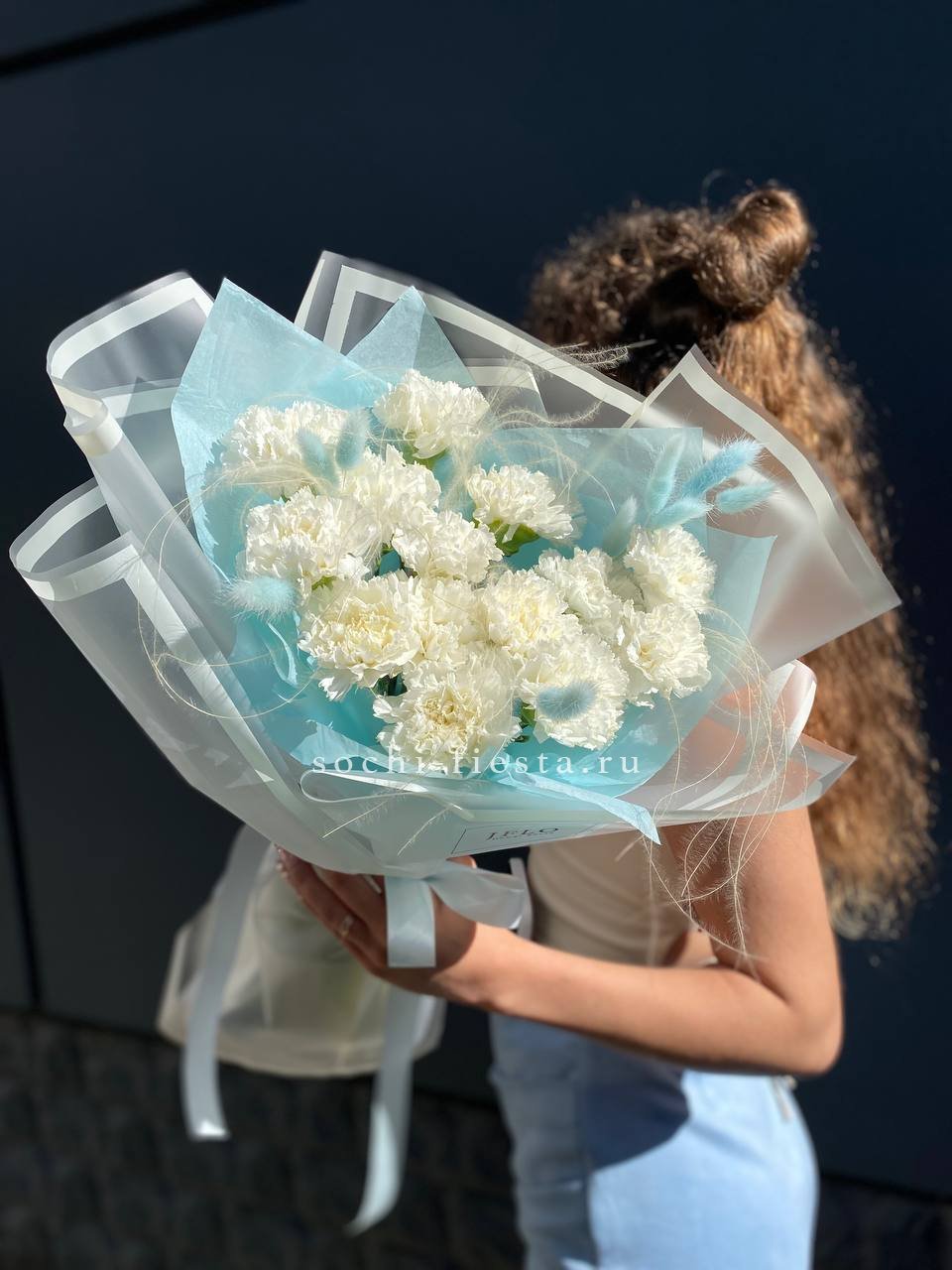 Букет из пятнадцати белых диантусов вписывается в любое пространство благодаря компактной форме. Цветы долго сохраняют свежесть и не требуют сложного ухода.