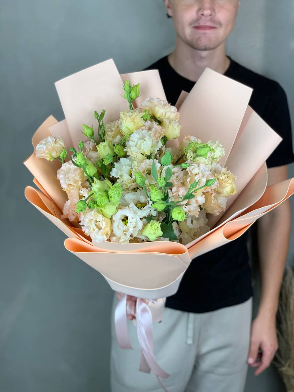 Пятнадцать воздушных эустом собраны в пудровое облако с мягкими переходами оттенков. Многослойные бутоны создают объёмную текстуру и удивительную глубину композиции.