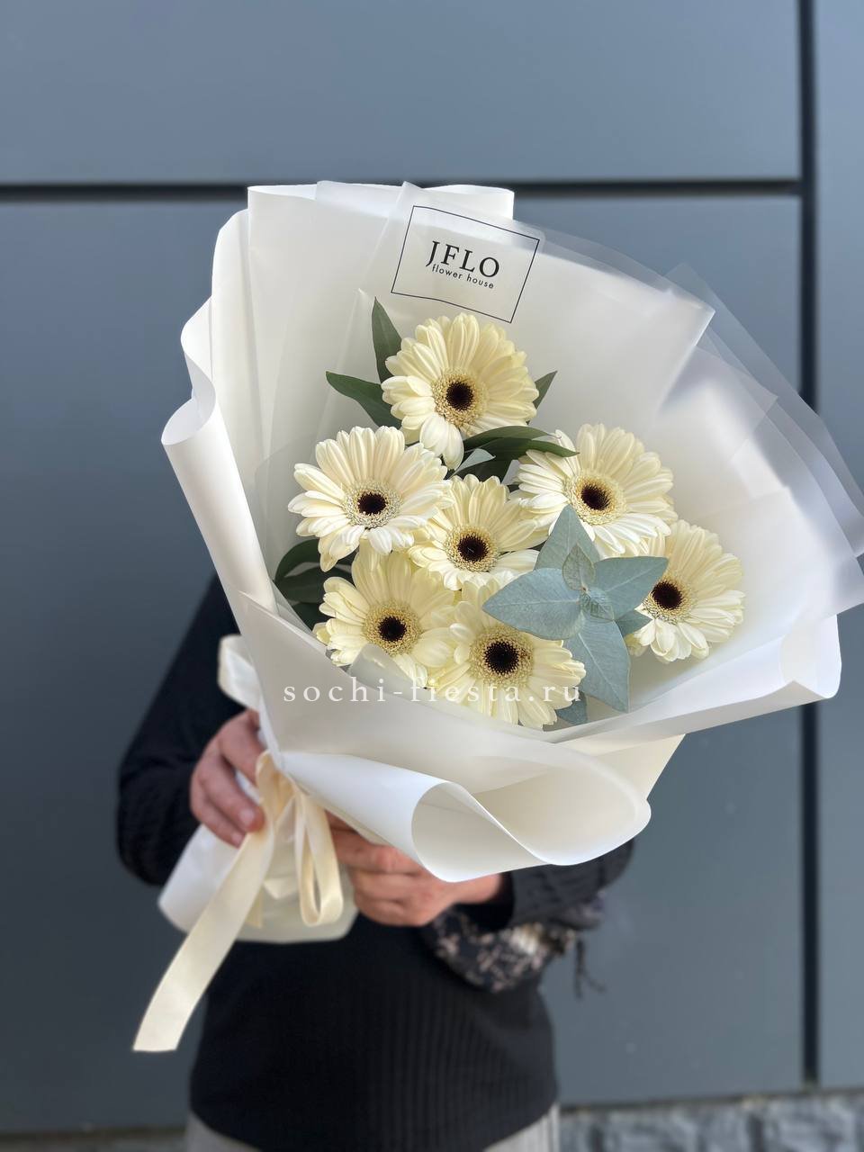 голландская гербера 7 шт., лента, дизайнерская упаковка Оттенок гербер может быть согласован с заказчиком.