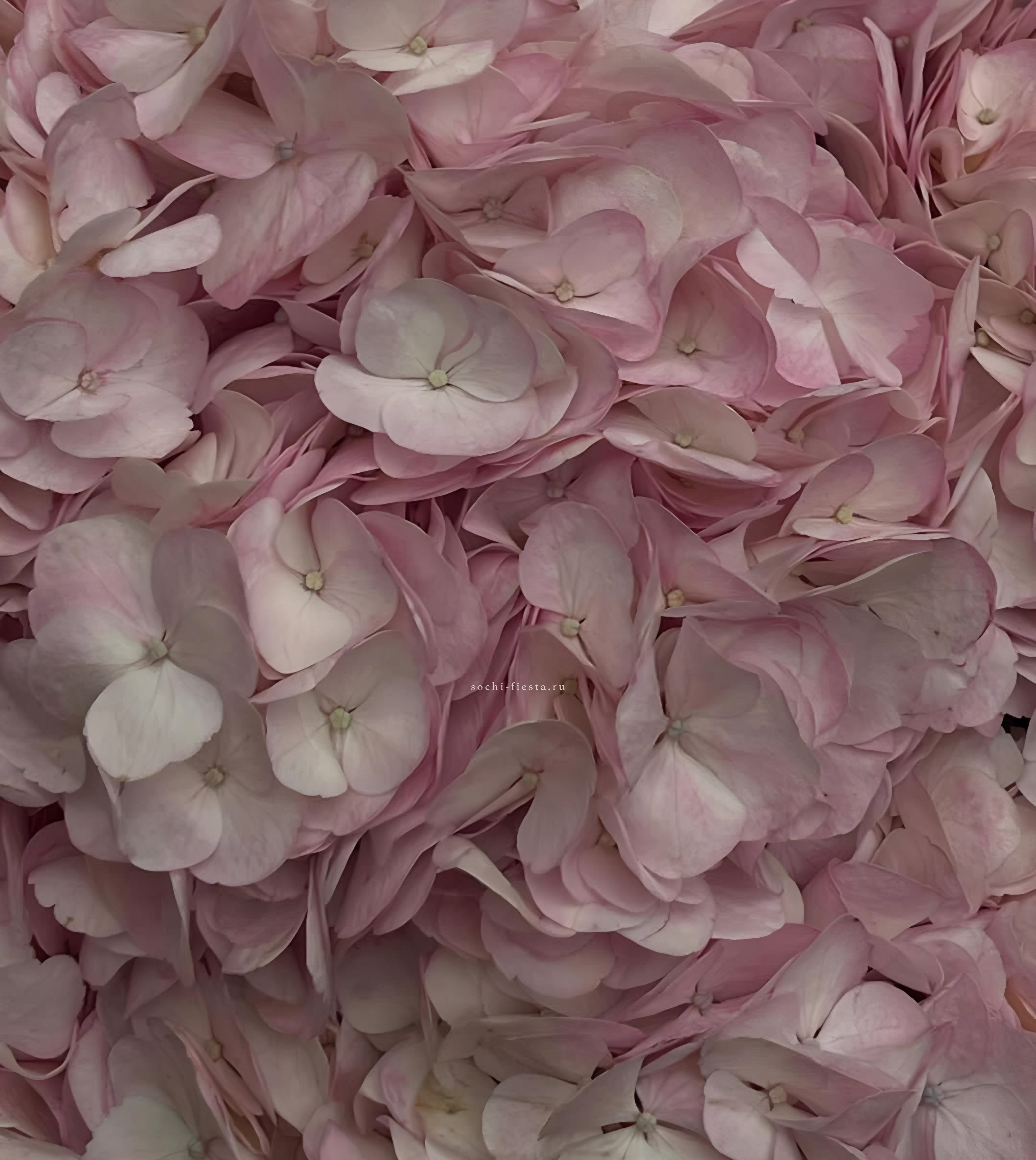 Пятнадцать соцветий гортензии образуют густую сферу с насыщенной глубиной цвета. Объёмная композиция заполняет пространство и притягивает внимание своей плотностью.