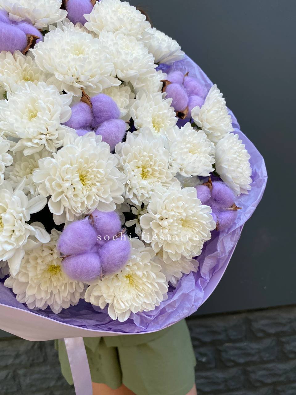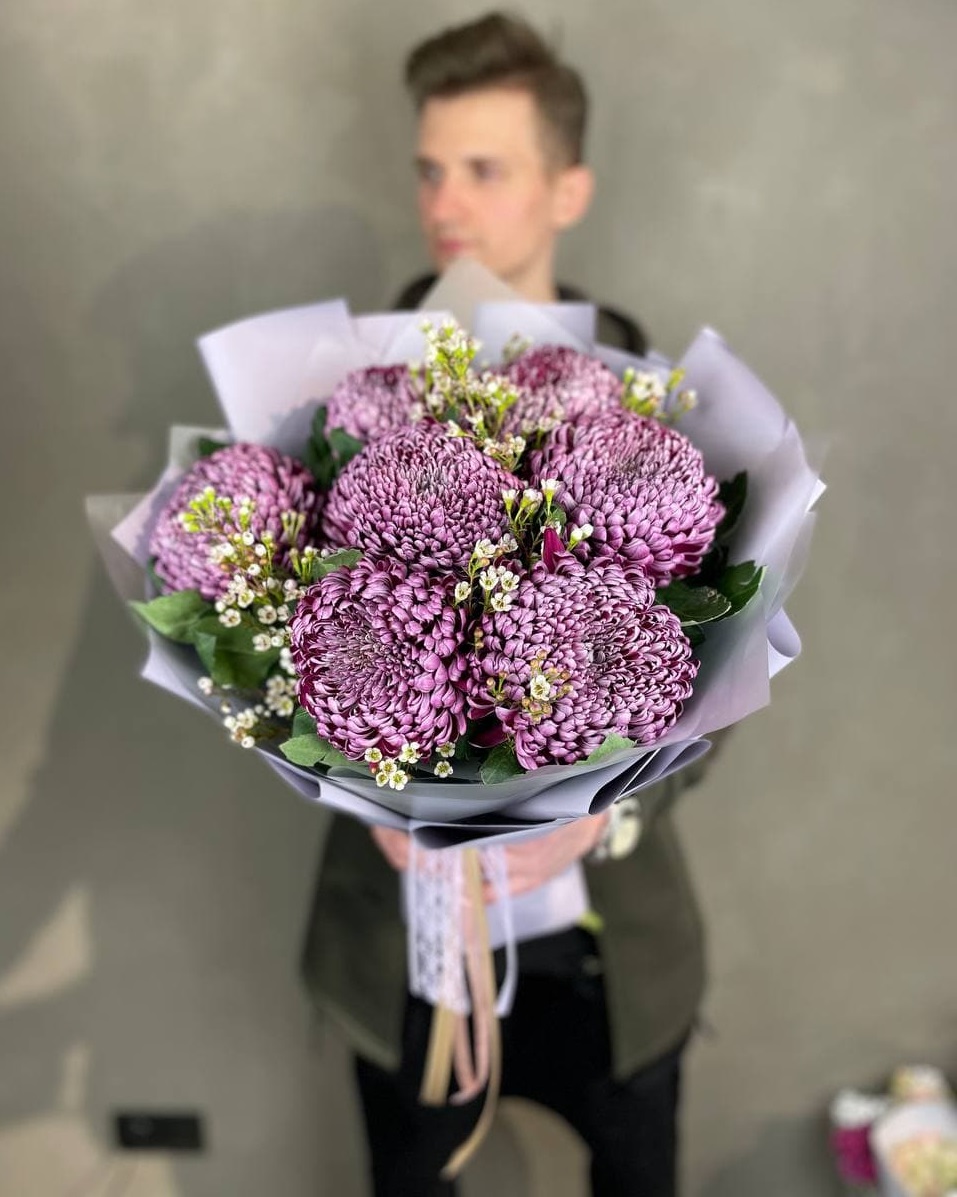 минимальный состав: 7 одноголовых хризантем, лента, упаковка на выбор.