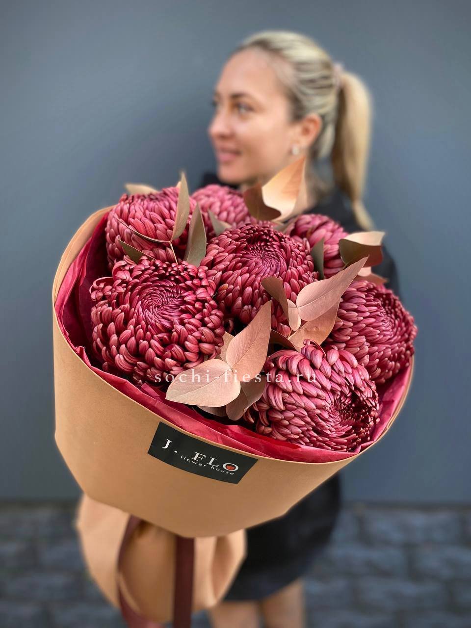 Теплый шоколадно-золотой оттенок хризантем создает уютное осеннее настроение. Семь пышных соцветий собраны в компактную композицию с веточками эвкалипта.