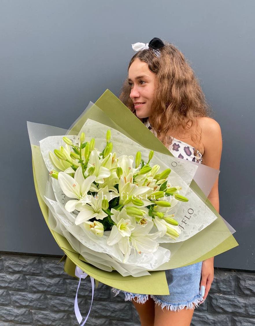 Насыщенный зелёный оттенок упаковки перекликается с природной свежестью лилий. Семь бутонов формируют объёмную композицию с выразительным цветовым акцентом. Букет привлекает внимание и удерживает его надолго.