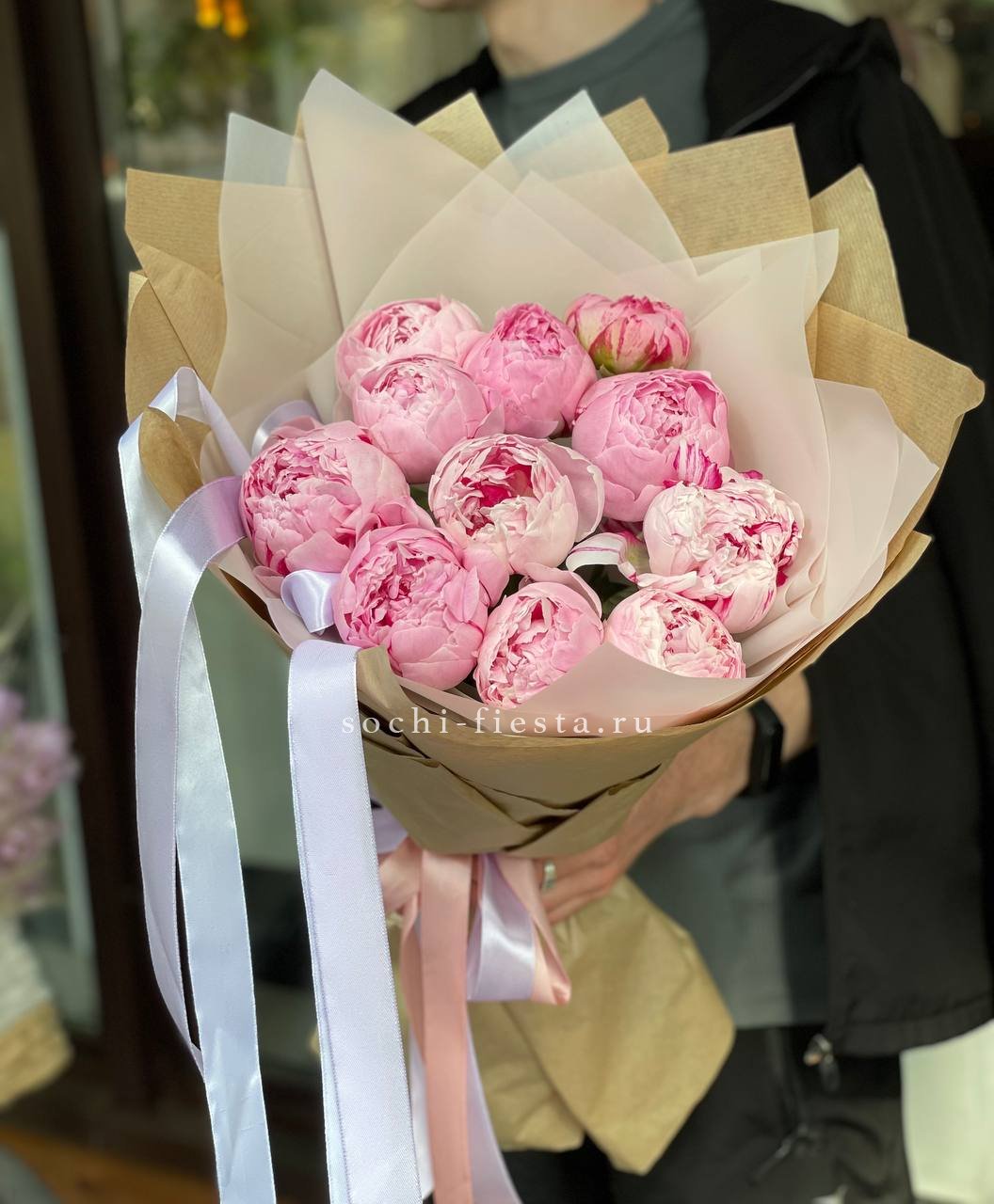 Розовые пионы собраны в плотный букет с выразительным объемом. Крафтовая обертка удерживает форму и позволяет удобно разместить композицию в любой вазе. Одиннадцать бутонов создают яркое присутствие в пространстве.