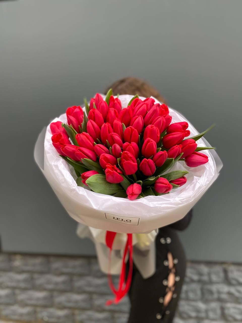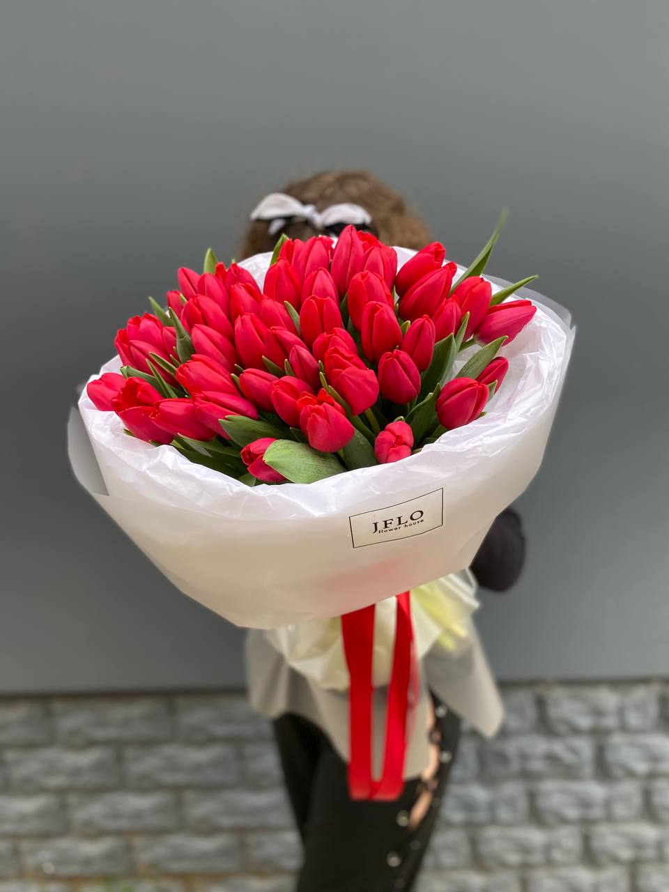 Сто один тюльпан в светлой гамме создаёт впечатляющий объём и выразительное присутствие. Плотная сборка бутонов образует графичную форму с чётким силуэтом.