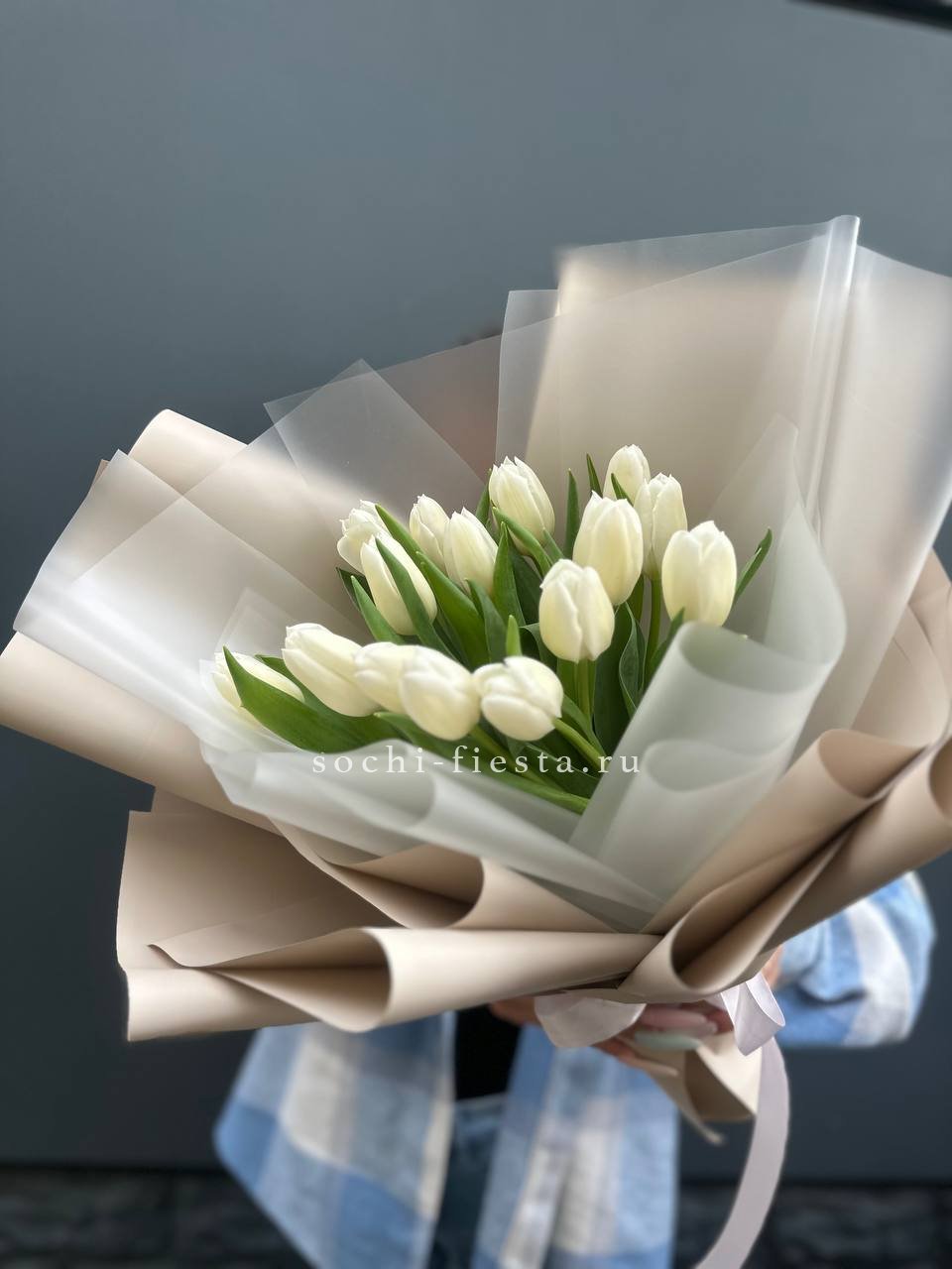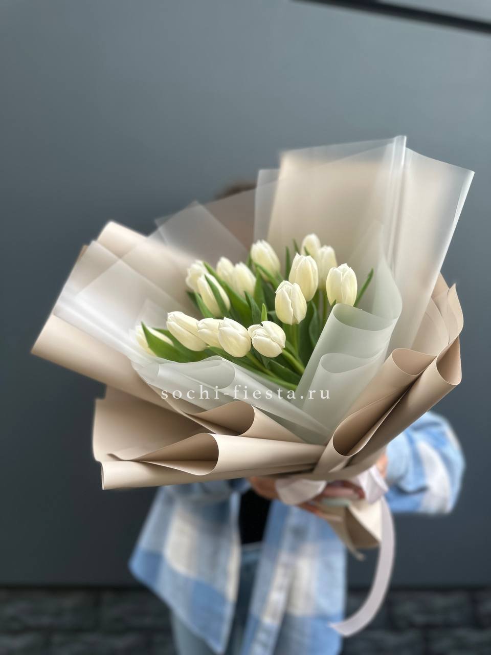 101 белый тюльпан, лента, крафт или дизайнерская пленка.