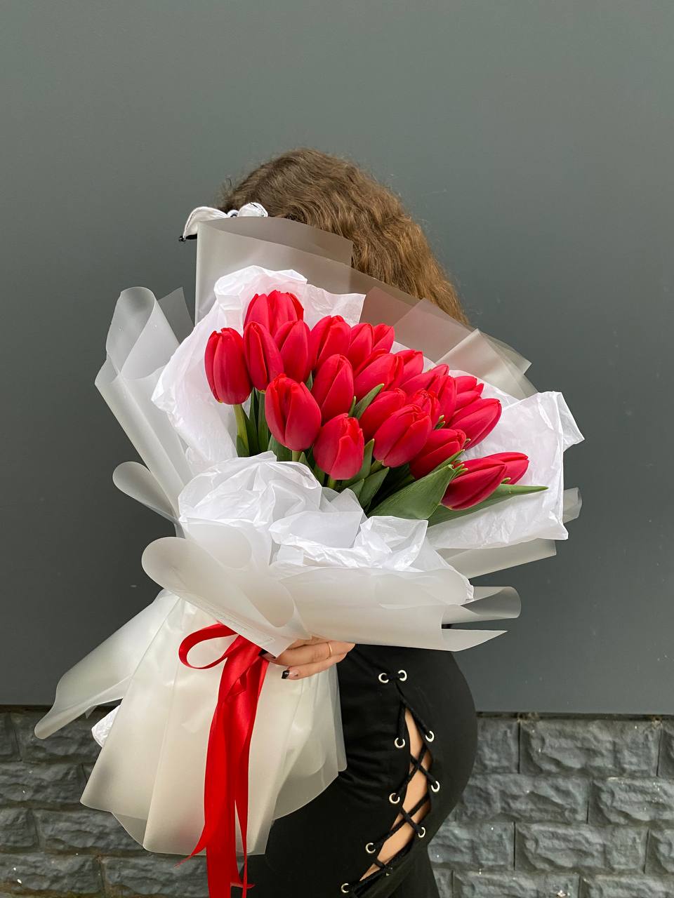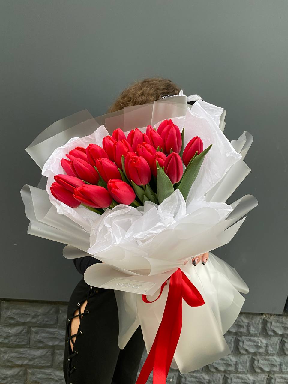 Состав букета: 39 тюльпанов, амарантус (аналог),  лента, упаковка.