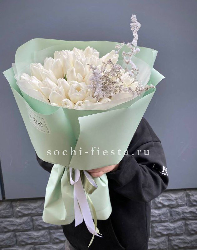 Плотная сборка из 39 белых бутонов с лёгкими нитями амаранта создаёт объёмную вертикальную форму. Белоснежные головки тюльпанов образуют упругий купол с чётким ритмом.