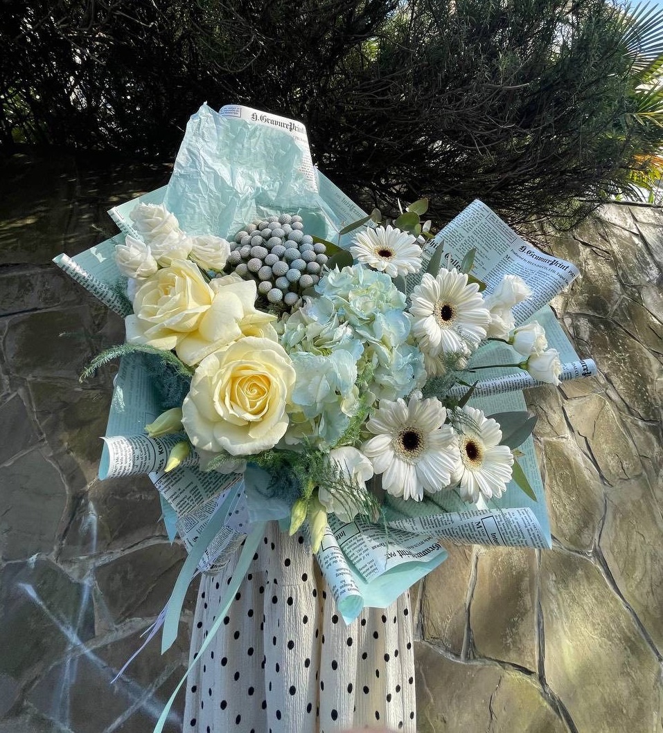 Воздушная композиция собрана из гортензии, роз, эустомы и гербер в голубых и белых оттенках. Бруния и эвкалипт добавляют объём, а аспарагус создаёт лёгкую дымку вокруг цветов. Букет хорошо держит форму и долго сохраняет свежесть.