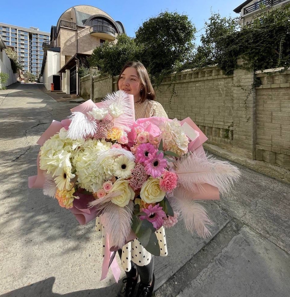 Пышные соцветия гортензий перекликаются с герберами и розами, создавая многослойную композицию с выразительной глубиной. Озотамнус и перья добавляют воздушности, а эвкалипт собирает все оттенки в единый ритм. Букет для тех, кто видит красоту в деталях.