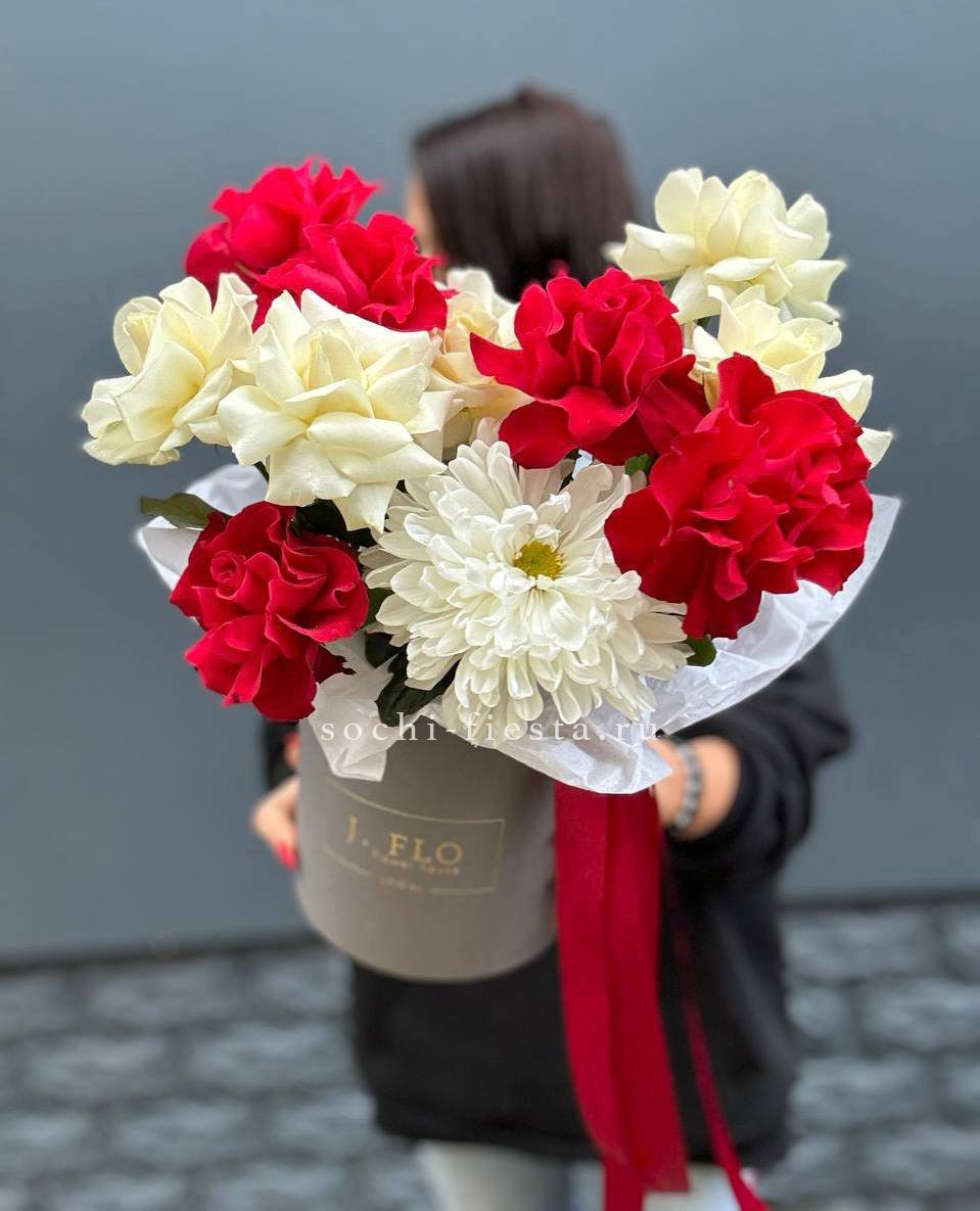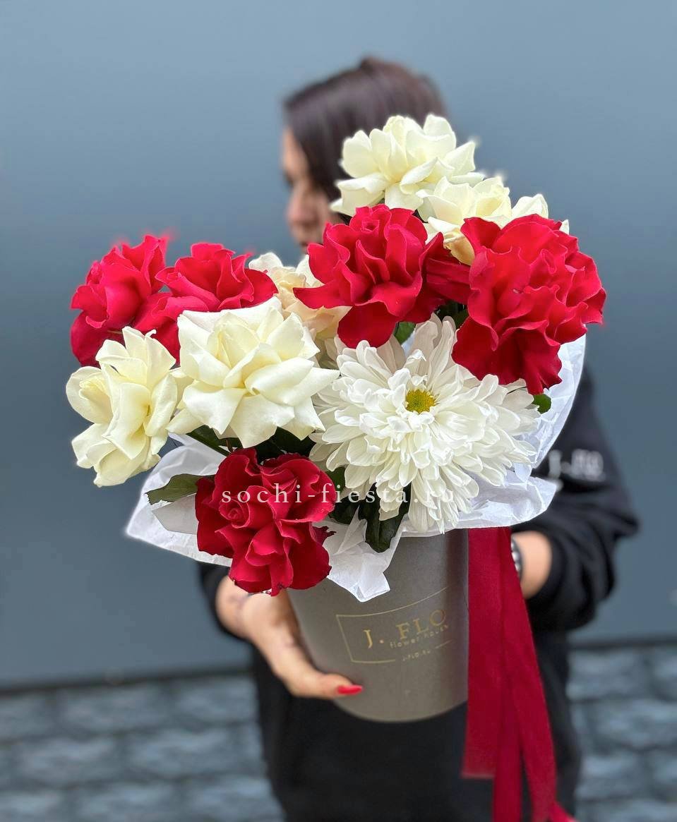 Плавные линии пышных соцветий гортензии переходят в округлые формы пионовидных роз и воздушные бутоны эустомы. Диантусы добавляют графичности, а дизайнерское оформление задает общий ритм композиции. Букет для пространств с характером.