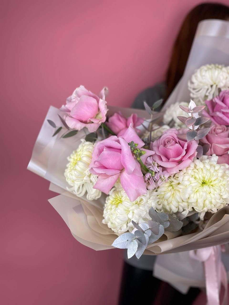 Плотная сборка из роз и хризантем с волнами маттиолы создает густую текстуру. Эвкалипт добавляет графику, а авторская упаковка завершает форму. Букет держит объем и выглядит цельно.
