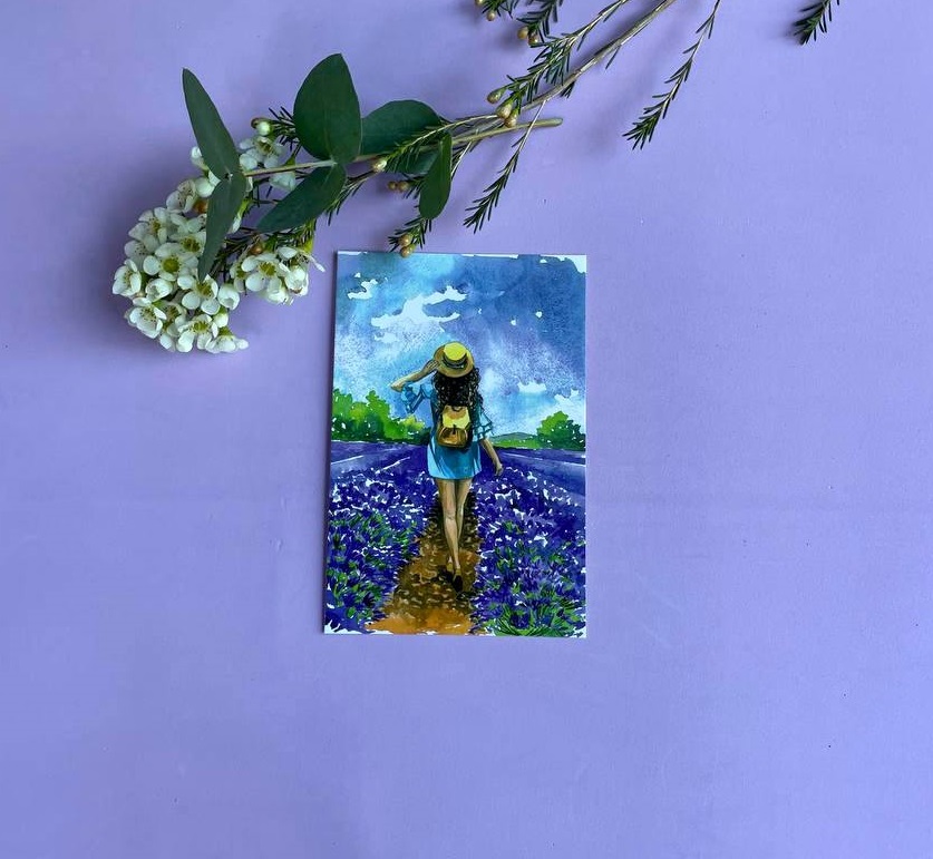 Карточка с цветочной дорожкой вмещает короткое послание из пяти-семи фраз. Графика создаёт лёгкое обрамление для ваших слов без лишней пестроты.