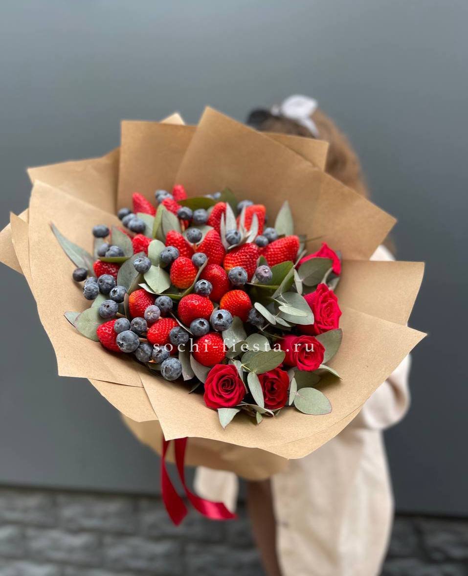 красные розы- 5 шт., ароматная клубника - 500-600 г., голубика - 100 г., фисташка или эвкалипт, лента, крафт.