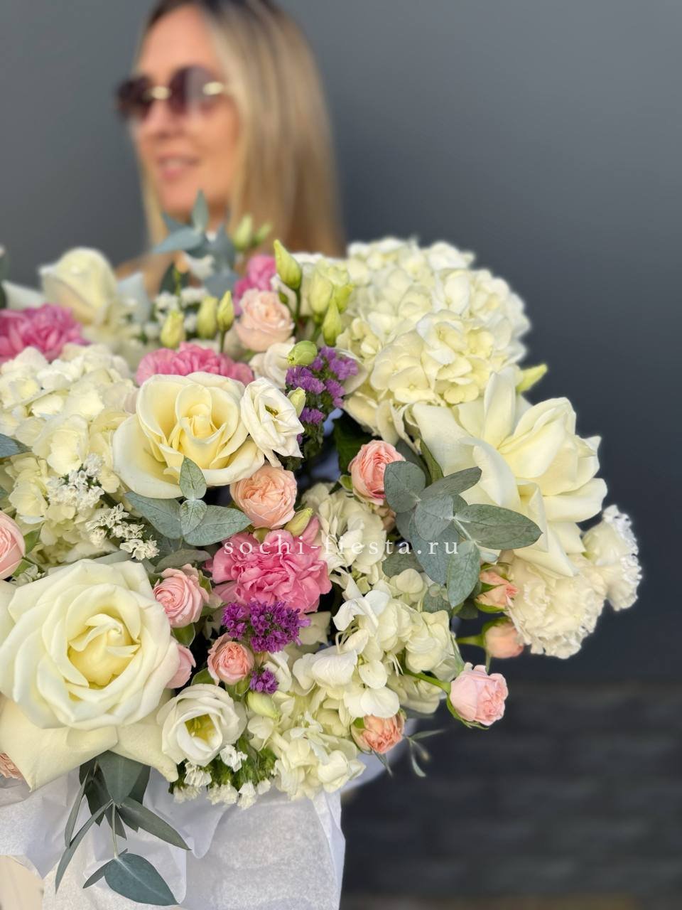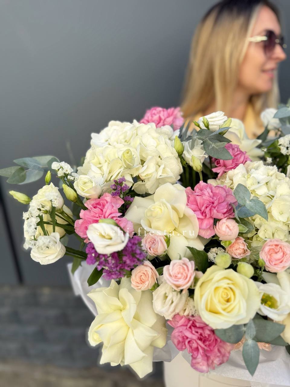 Белоснежные розы и воздушная эустома соседствуют с пышной гортензией и яркими вспышками статицы. Композиция собрана плотно, каждый цветок находит своё место в общем ритме.