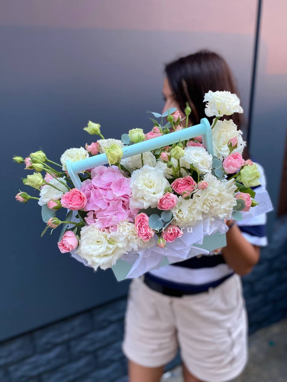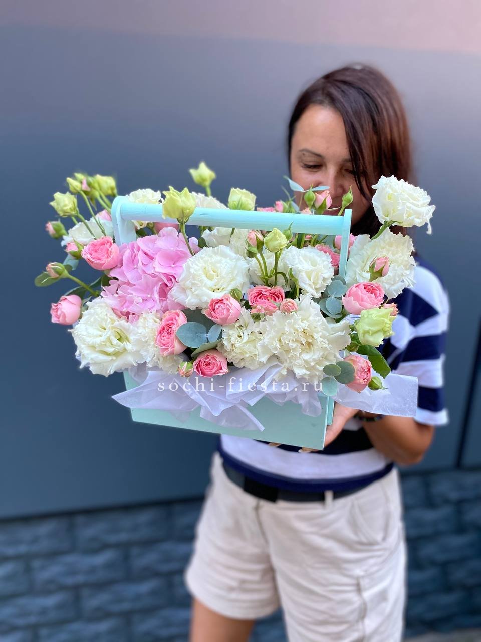 цветочная композиция в нежно-кремовых тонах с применением гортензии, эустомы, кустовых роз, деревянный ящик, лента.
