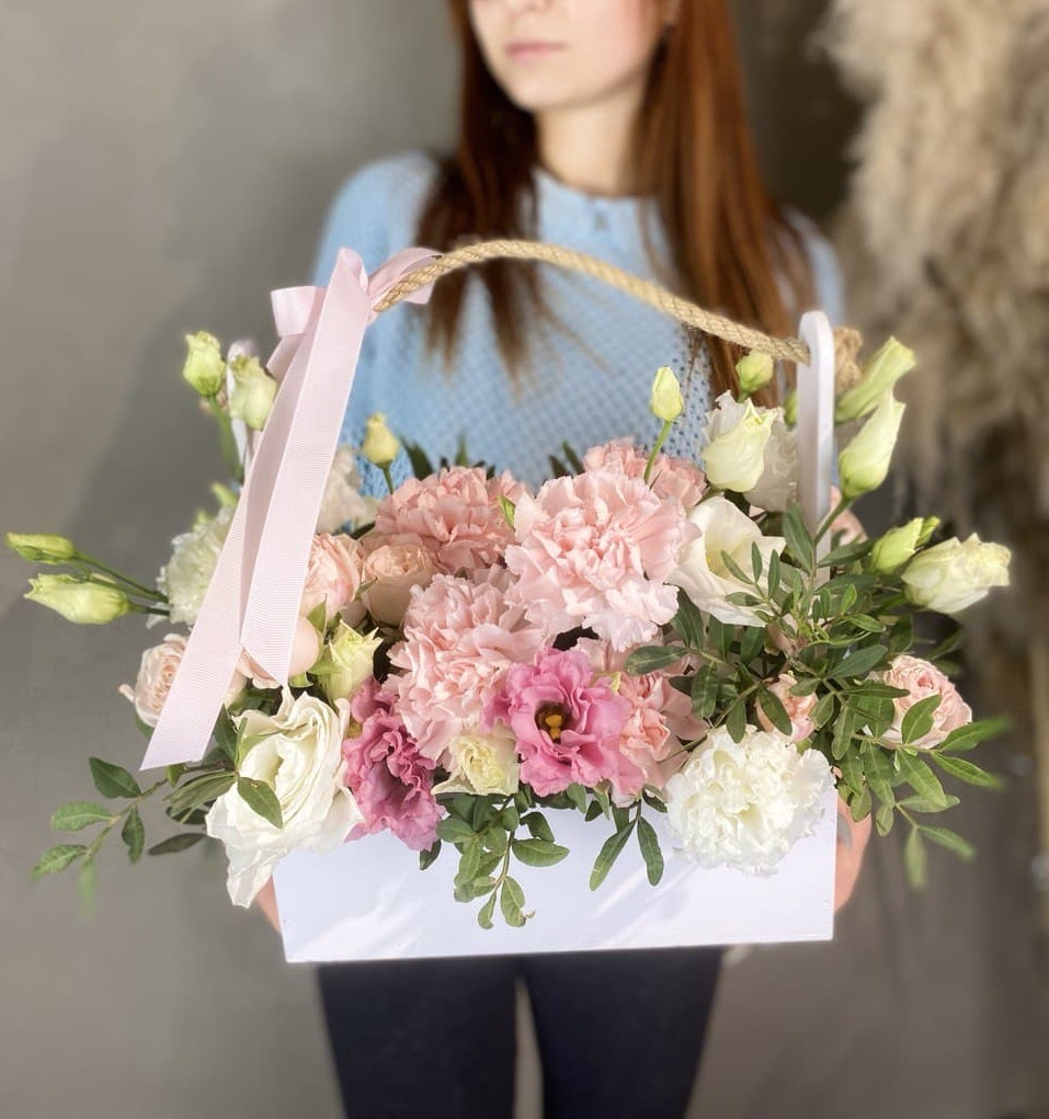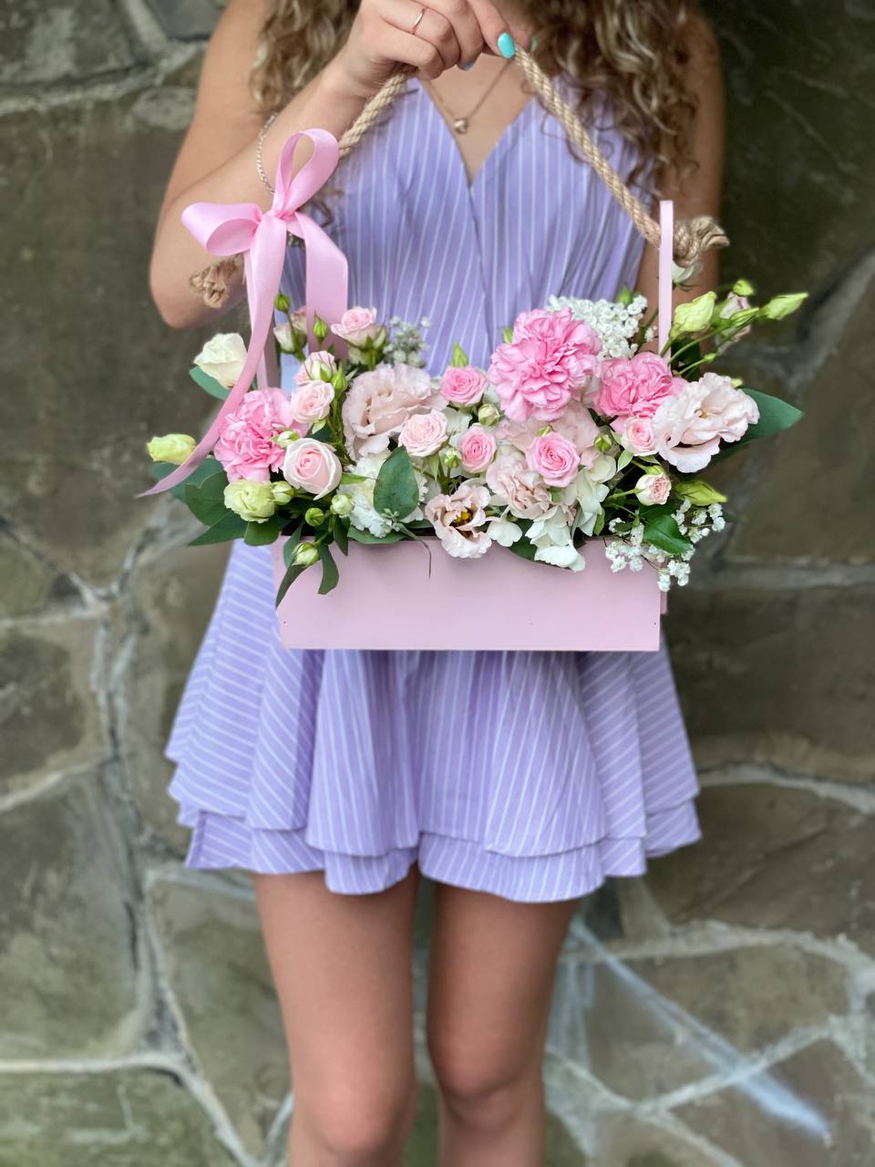 Кремовая палитра с переходами в цвете создаёт мягкое свечение композиции. Гортензия и эустома образуют воздушную текстуру, а кустовые розы добавляют объём. Деревянный ящик завершает природную эстетику.
