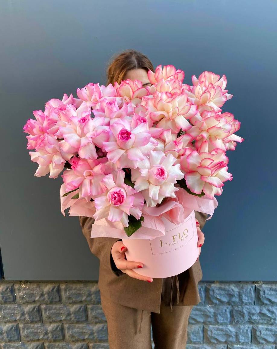 Двадцать пять вывернутых французских роз наполняют белый цилиндр графичной структурой. Бутоны раскрыты плотно, лепестки образуют многослойную текстуру с мягкими изгибами и глубиной.