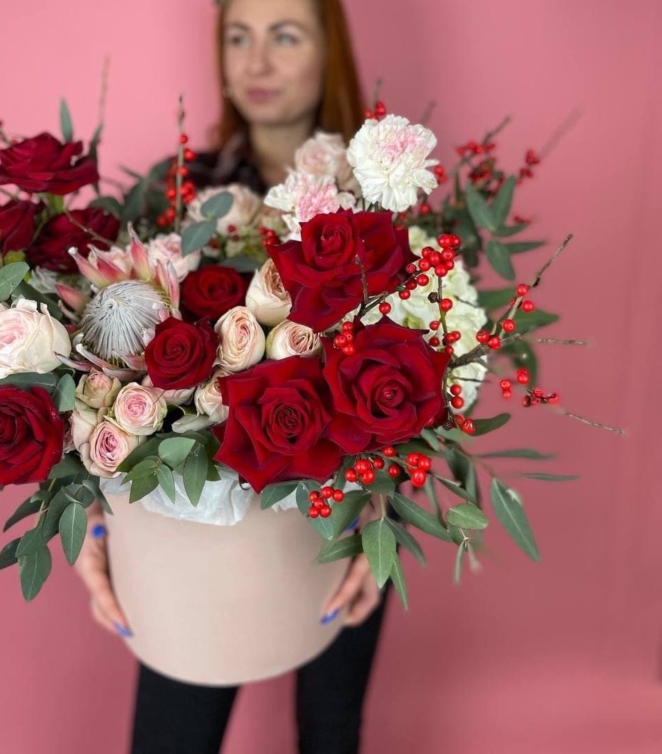 Объемные головки пионовидных роз сплетаются с фактурной протеей и ягодами илекса. Композиция наполняет пространство цветом и создает ощущение живого сада в боксе.