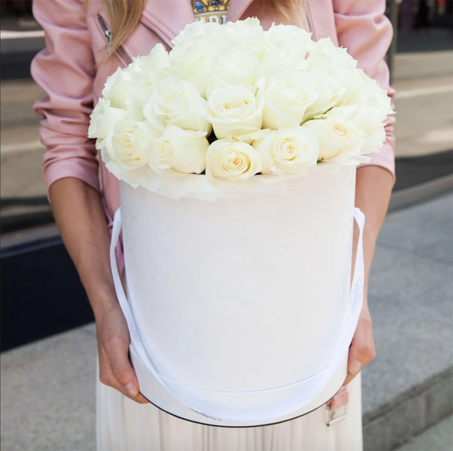 Тридцать пять белоснежных бутонов образуют плотное соцветие безупречной формы. Светлый цилиндр подчеркивает чистоту линий и создает завершенный монохромный образ.