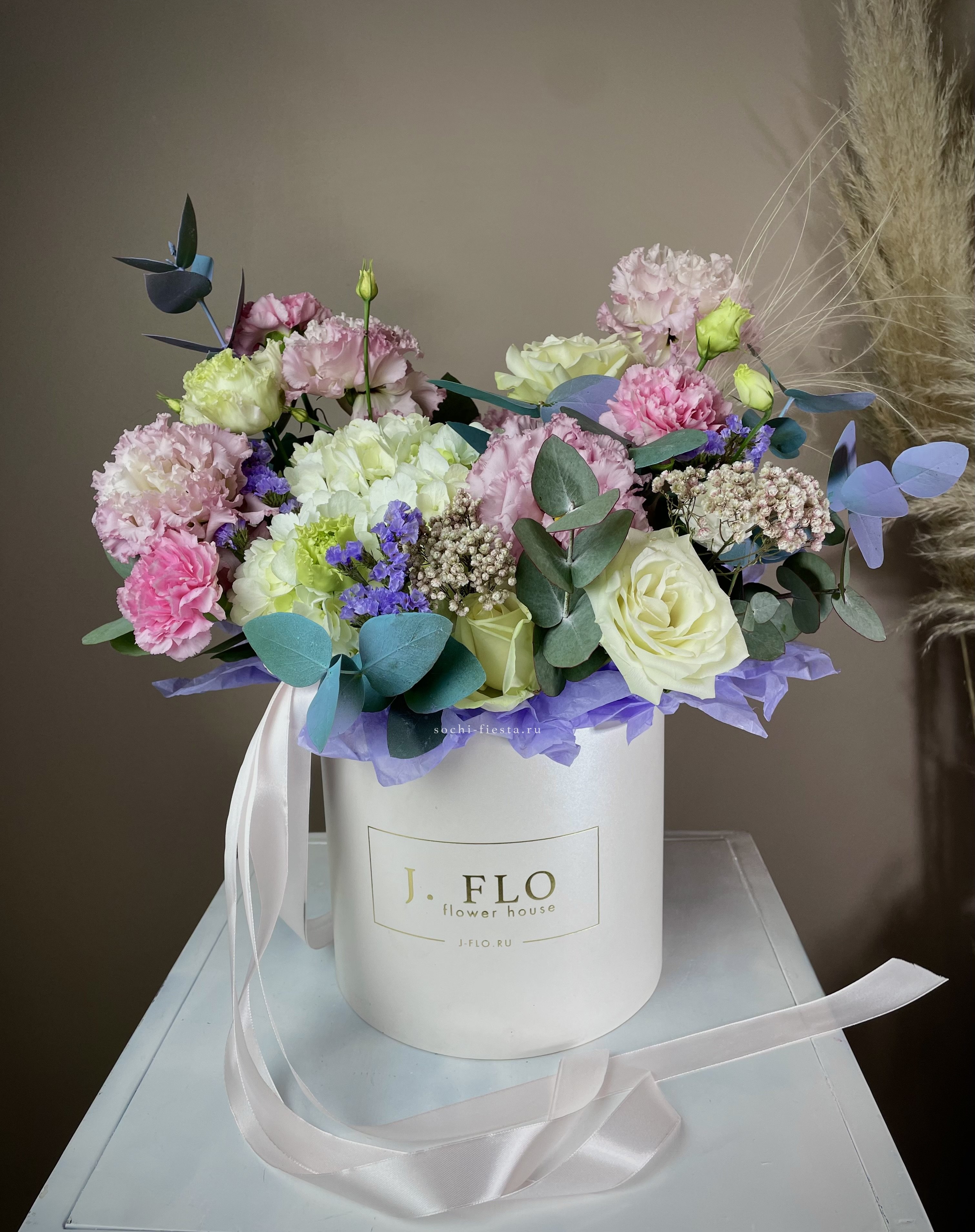 цветочная композиция в нежно-сиреневых тонах в сиреневом цилиндре D25.