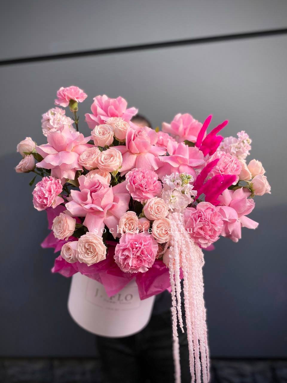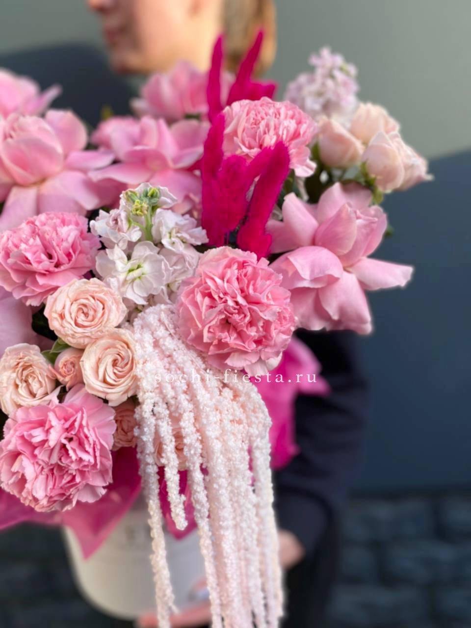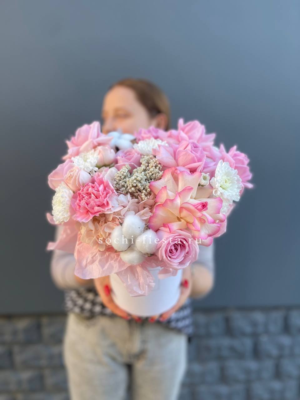 Объемная композиция занимает пространство уверенно и выразительно. Розово-белая гамма плавно перетекает от одного оттенка к другому. Крупный формат позволяет раскрыть всю красоту каждого цветка.
