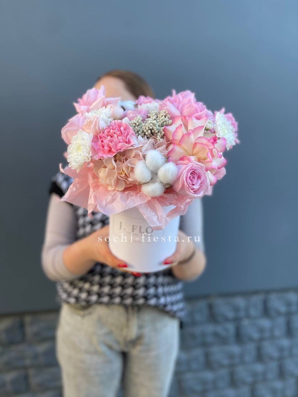 цветочная композиция в розово-белых тонах в розовом цилиндре D20-25.