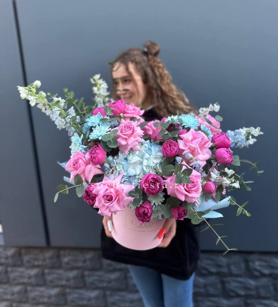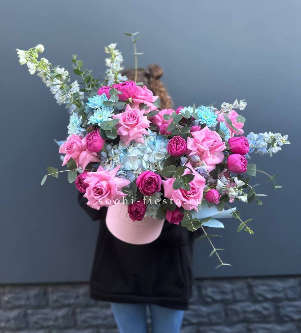 Эвкалипт обрамляет кустовые розы и гортензию, создавая многослойную структуру с зелеными переходами. Эустома добавляет легкости, а цилиндр держит форму аккуратной и собранной.