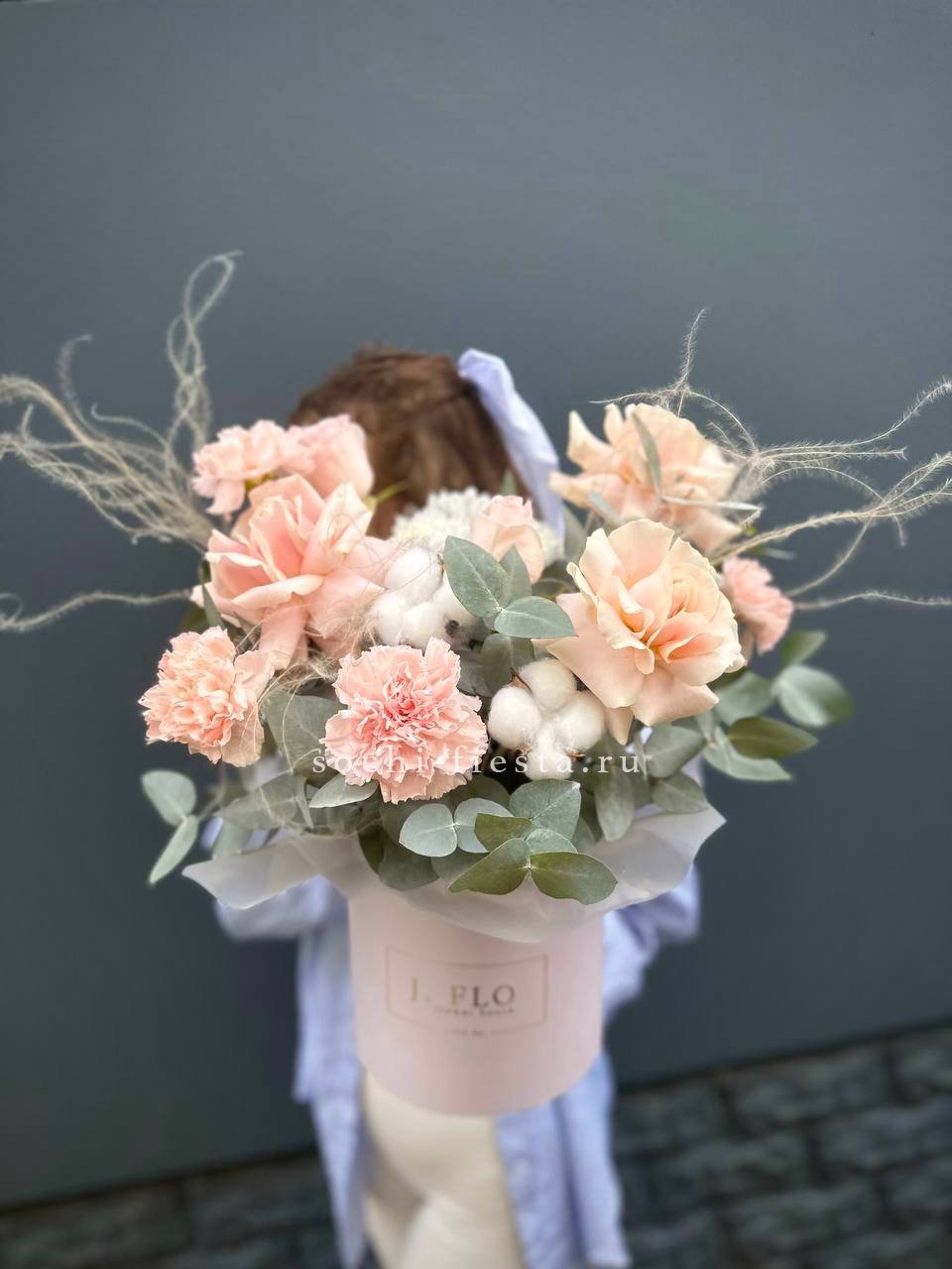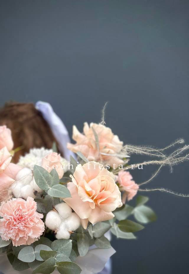 Пионы распускаются пышными шапками в окружении роз и душистой маттиолы. Эустома добавляет воздушности, а эвкалипт создает свежий акцент в цилиндре.