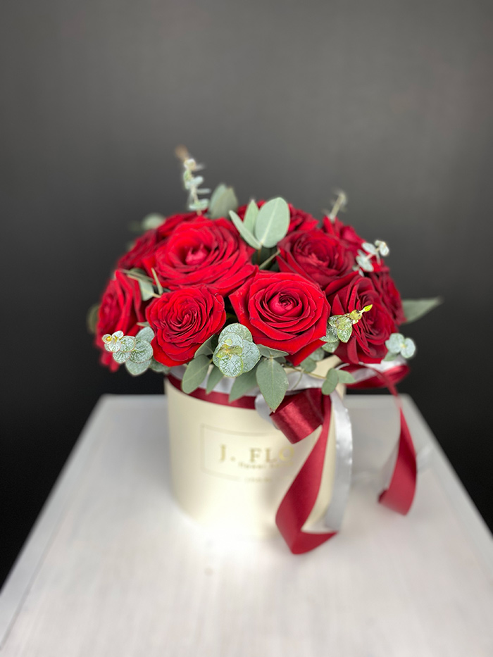 Пышные головки пионов собраны в плотную круглую форму и дополнены свежими ветками эвкалипта. Композиция в цилиндре держит силуэт и создаёт яркое присутствие в интерьере.