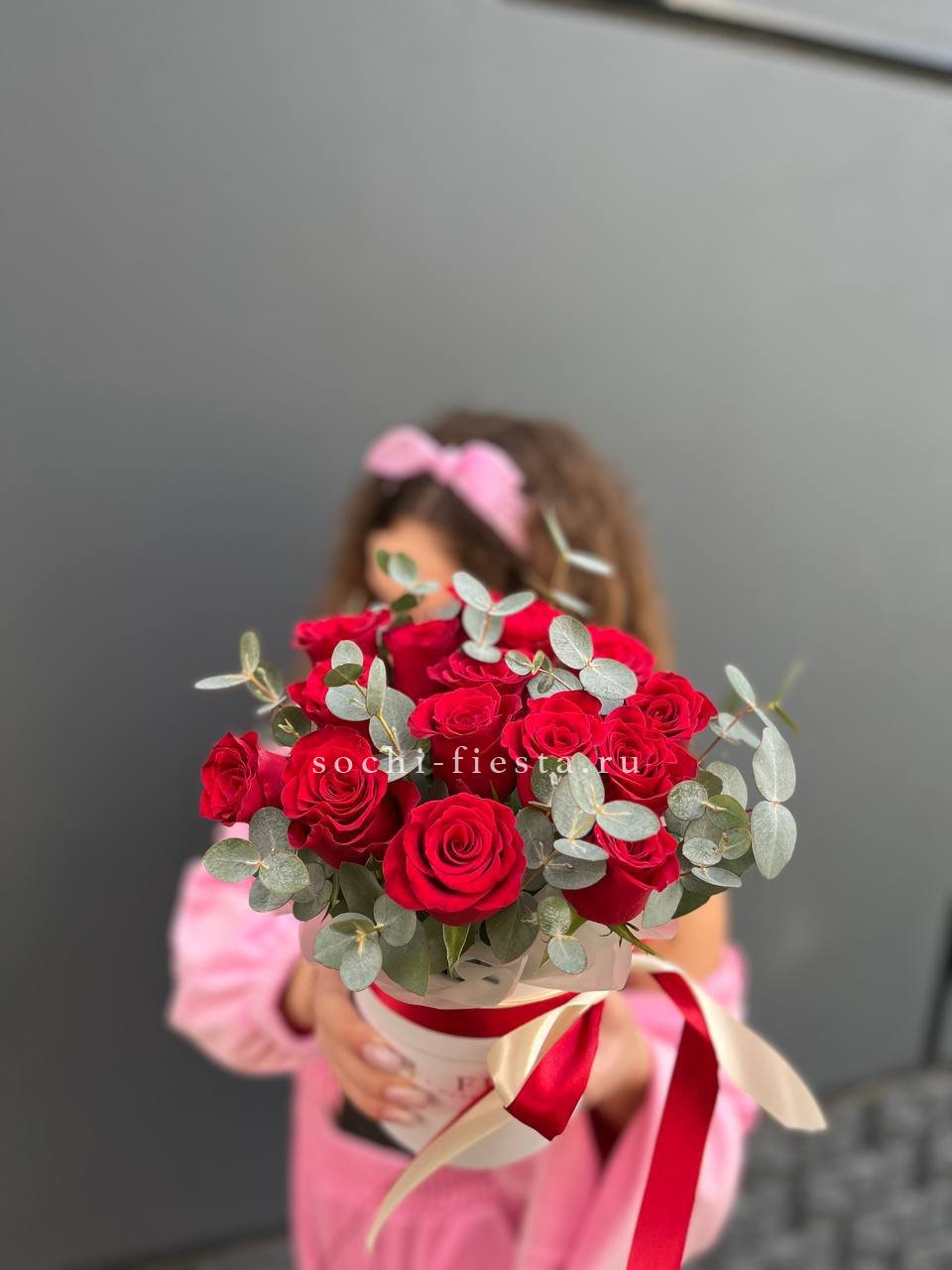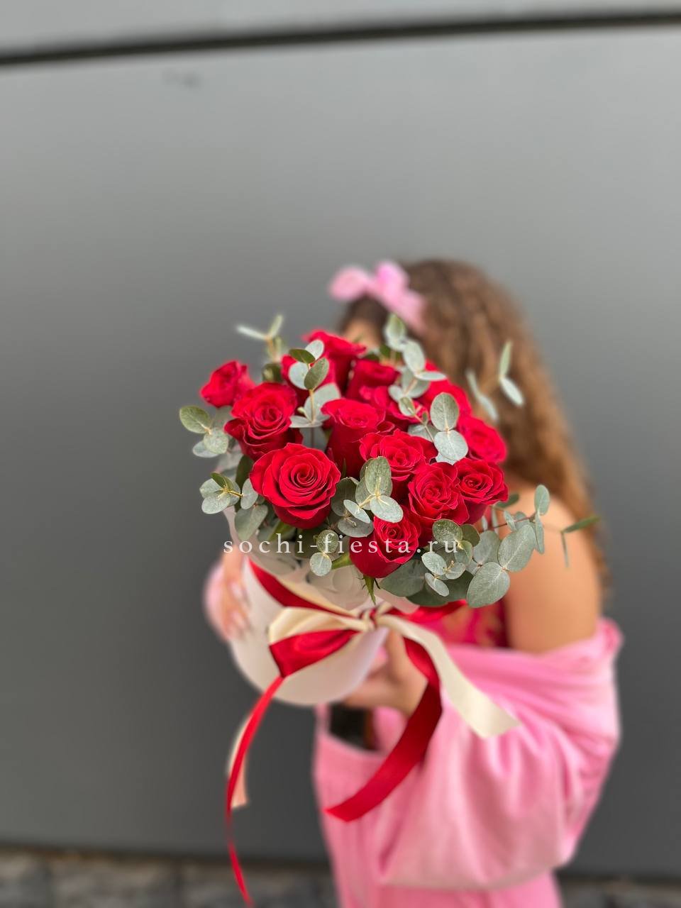 Пятнадцать красных роз уложены ровным куполом в круглом цилиндре. Ветки эвкалипта обрамляют бутоны и добавляют зеленые акценты по краю композиции.