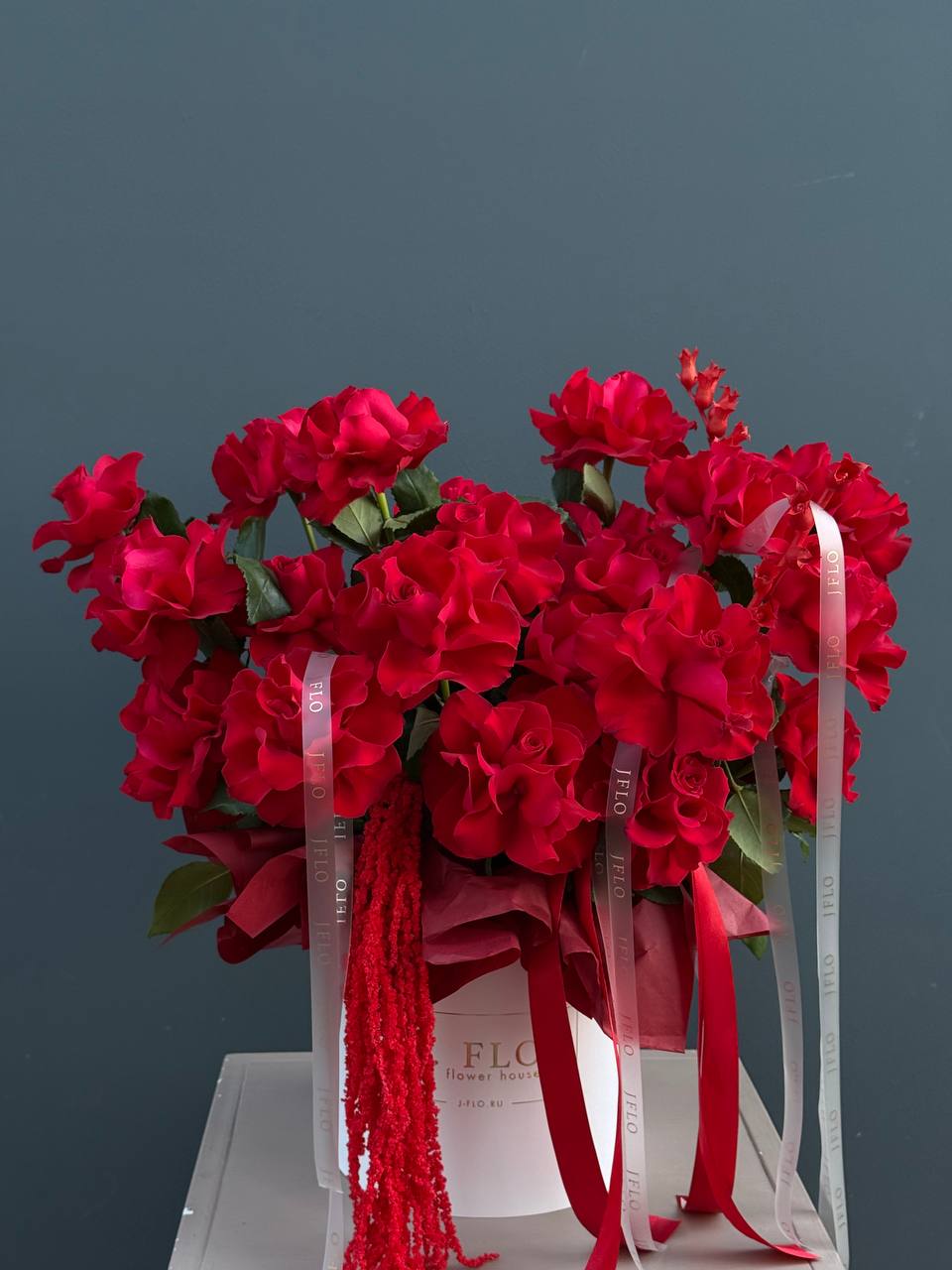 Пионовидные кустовые розы формируют плотный купол с мягкими переходами оттенков. Каждый бутон раскрывается слоями, создавая объёмную текстуру. Эвкалипт добавляет свежести композиции в цилиндре.