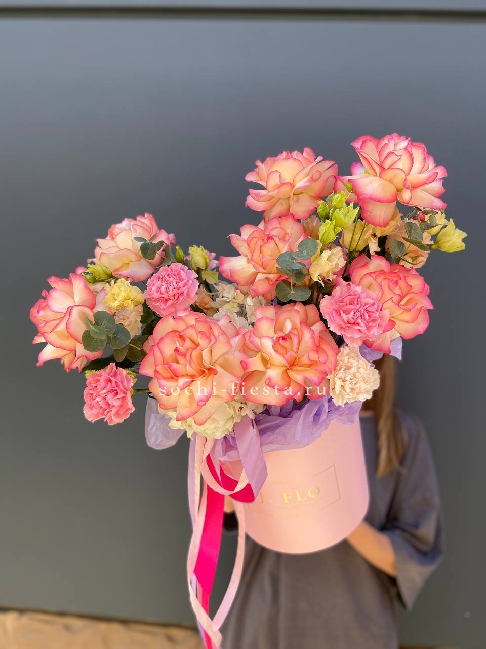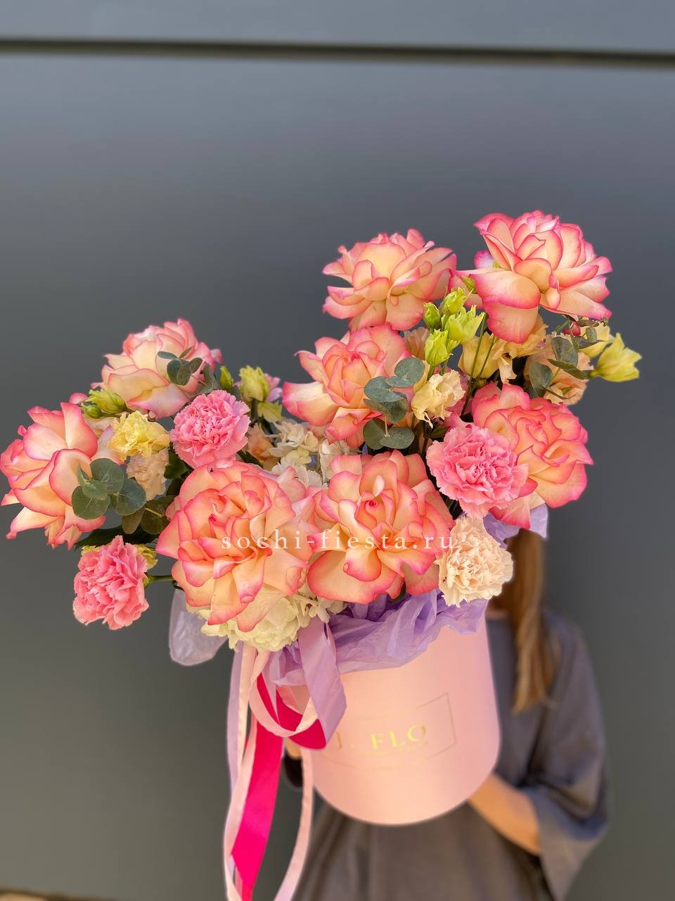 роза, диантус, пионы или гортензия, розы, бомбастик, эустома, декоративная зелень, цилиндр D16.