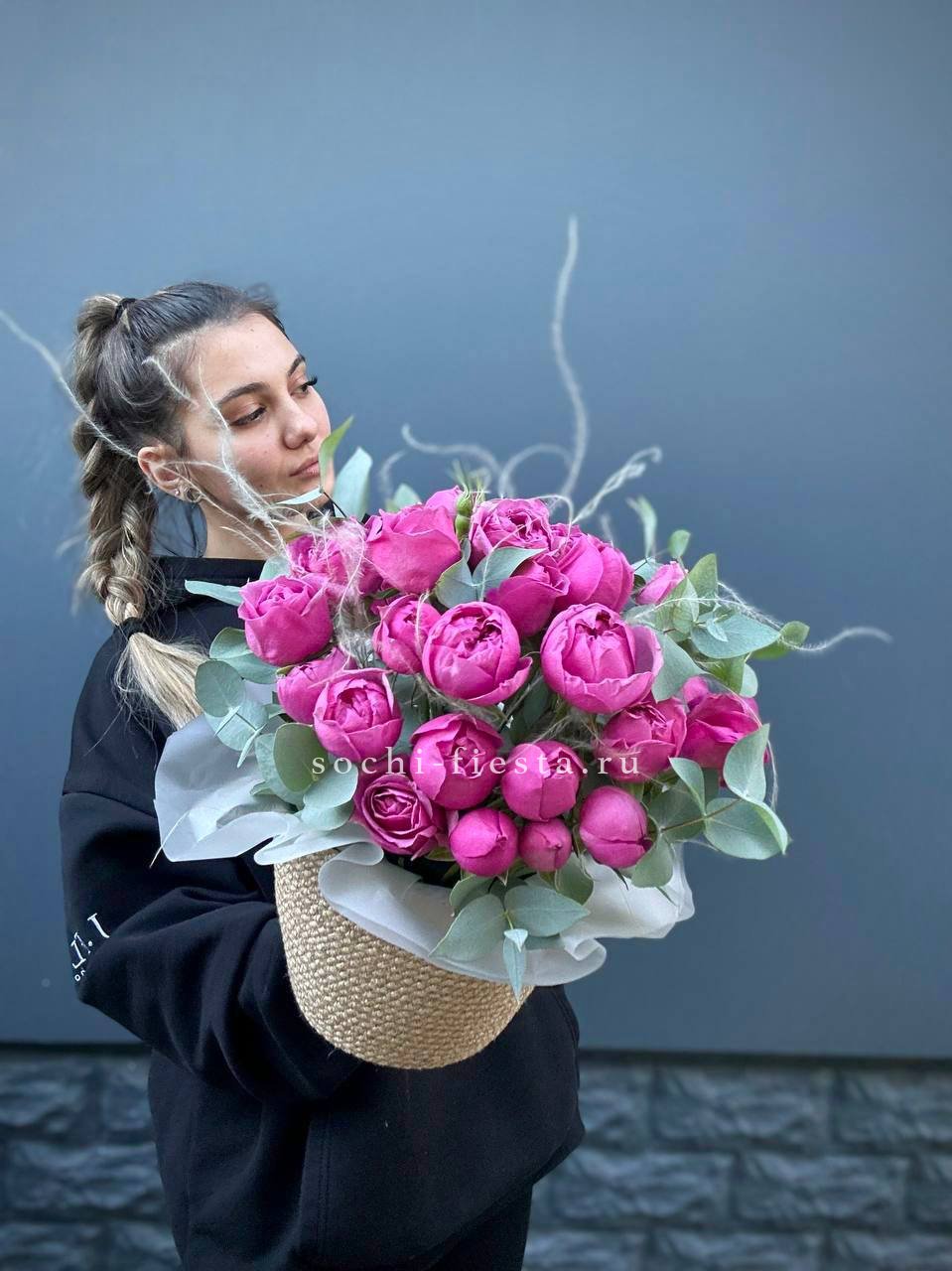 Мягкая палитра белых оттенков с вкраплениями диантуса создает воздушную композицию в натуральном джутовом кашпо. Кустовые розы добавляют объем, а эвкалипт завершает природную гармонию. Готовое решение для интерьера в спокойных тонах.