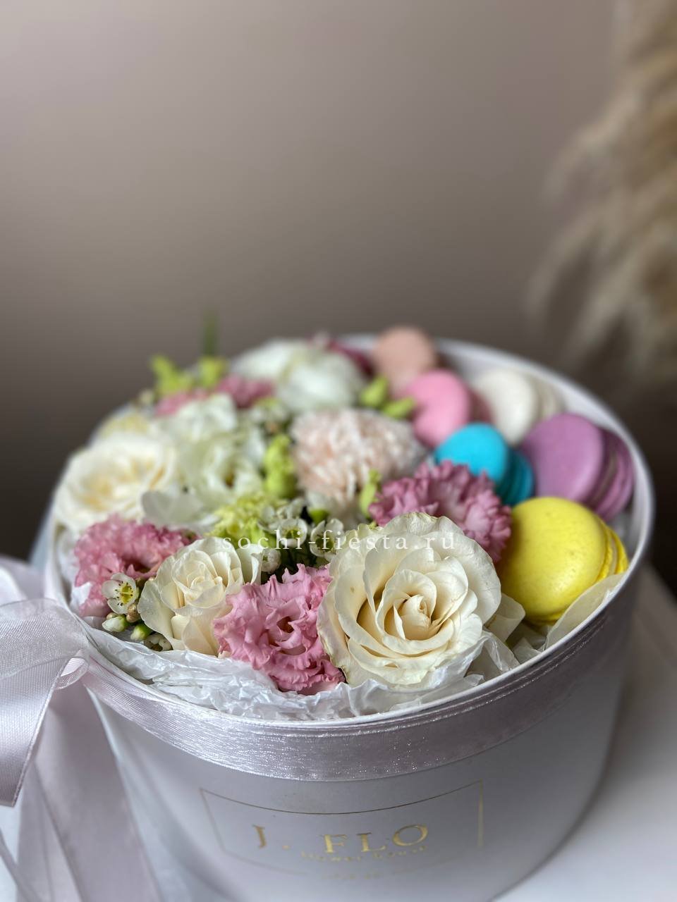 Пионовидные розы Мисти Баблс и Бомбастик образуют пышную фактуру с многослойными лепестками в розовой коробке. Шесть макаронс гармонично встраиваются в общий колорит композиции.