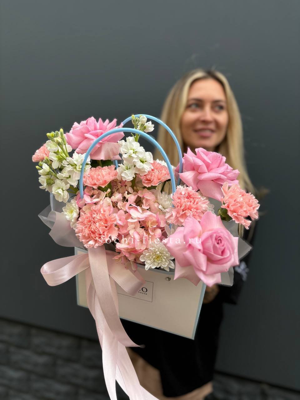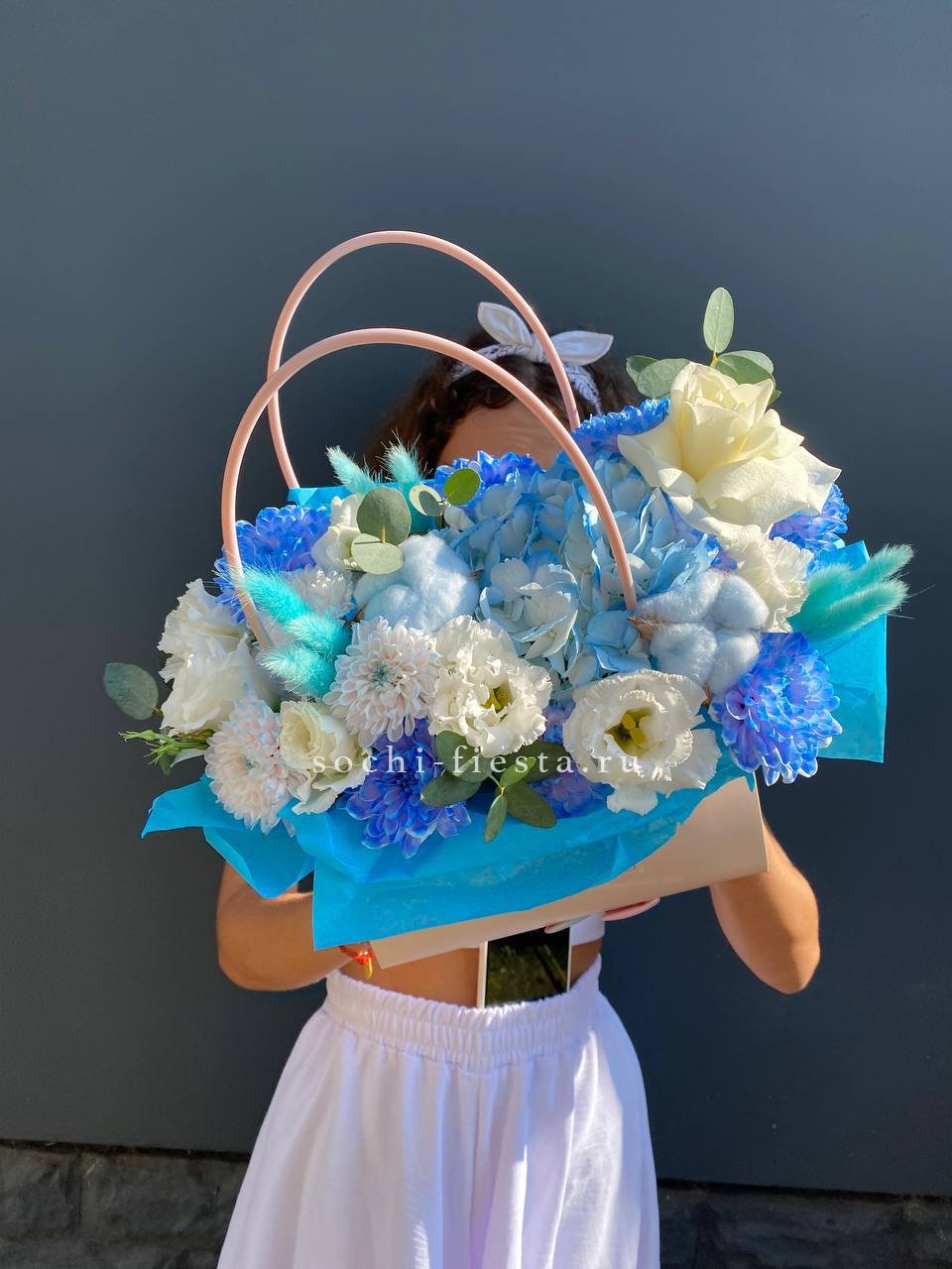 Голубая гортензия задаёт тон всей композиции, где хризантема и эустома создают объём, а хлопок с лагурусом добавляют воздушности. Сумочка вмещает насыщенную палитру без перегруженности.