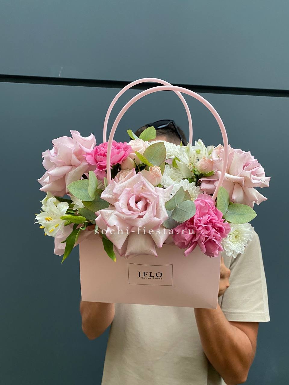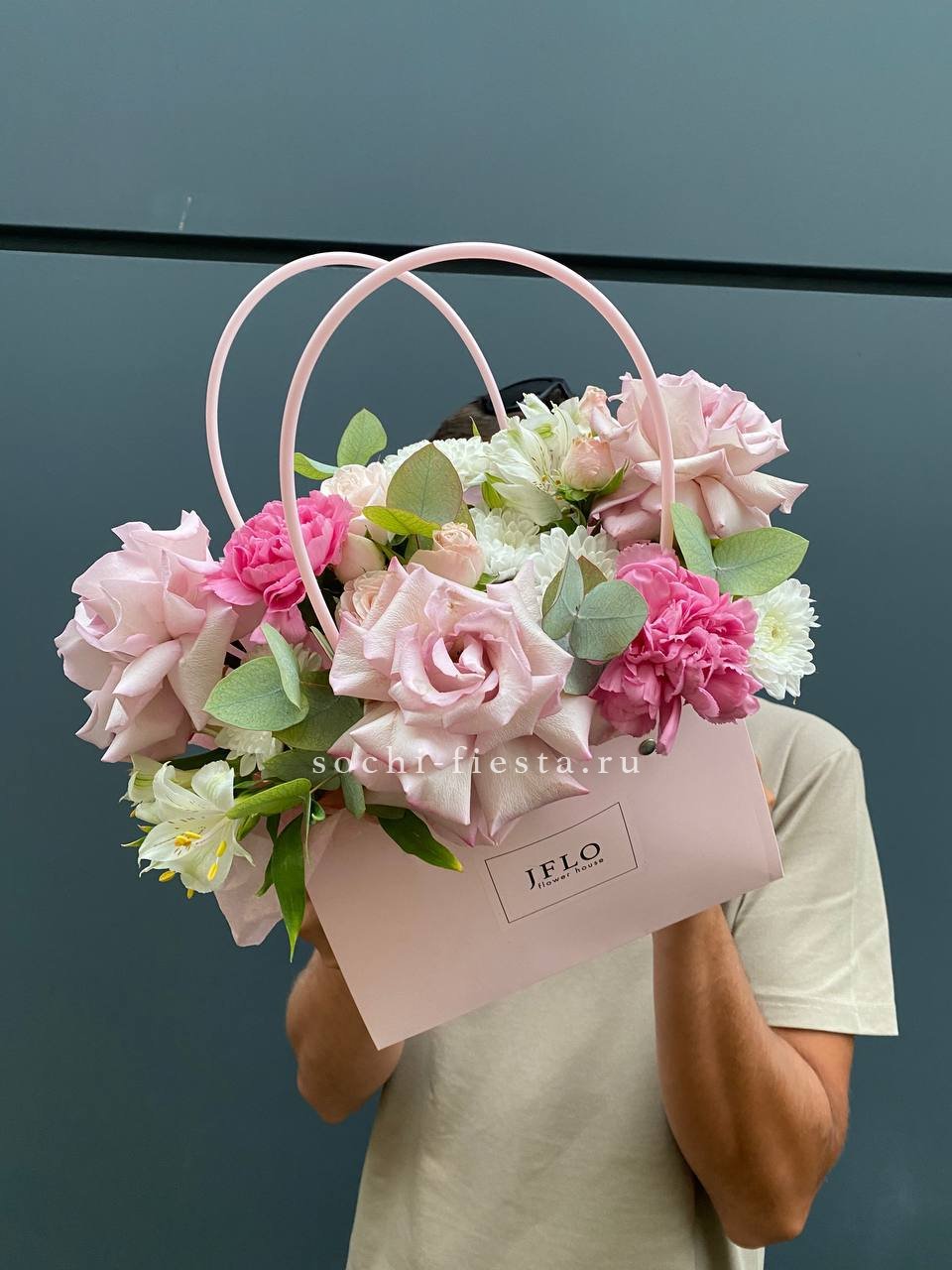белая роза, хризантема, хлопок, эустома, антиринум, сумочка.