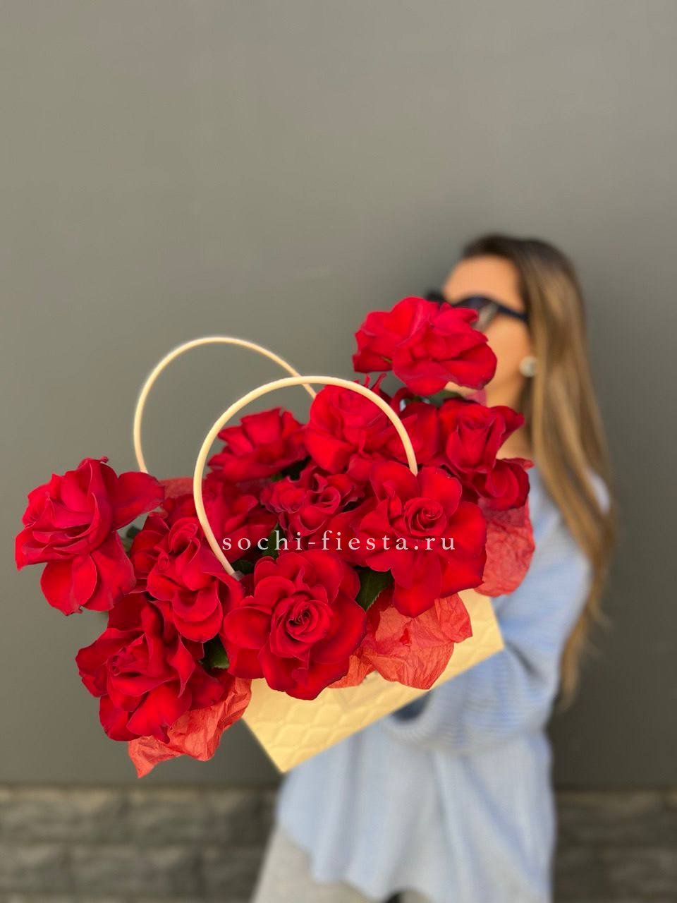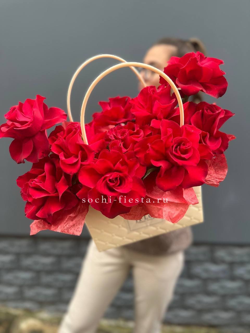 Яркая композиция в формате сумочки объединяет насыщенные герберы и белые розы. Бигуди добавляют графичности, эвкалипт завершает форму мягкими линиями.